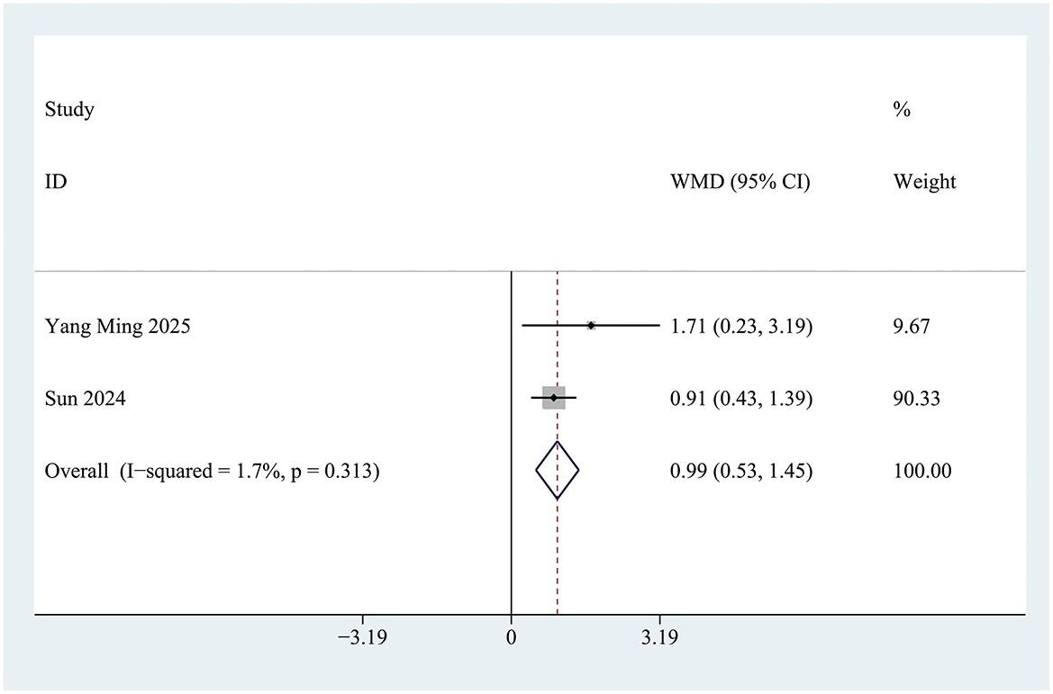 Two studies documented changes in Mini-Mental State Examination (MMSE) scores during the perioperative period. A statistically significant difference in perioperative MMSE score changes was observed between the INI group and the control group [Mean Difference (MD) = 0.99; 95% Confidence Interval (CI): 0.52 to 1.47; P < 0.001; I2 = 1.7%] (Figure 5). This improvement is considered clinically meaningful, as previous studies have shown that a postoperative increase in MMSE score of ≥0.5 points is associated with a significant reduction in the risk of long-term cognitive dysfunction.
