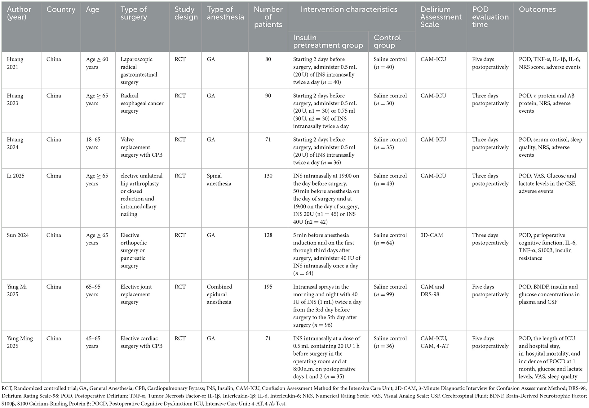 Intranasal insulin administration has emerged as a significant approach for addressing cognitive impairments linked to abnormal brain energy metabolism, garnering considerable attention in recent years (6–8). A substantial body of experimental and clinical evidence supports the effectiveness of intranasal insulin in treating chronic neurodegenerative diseases such as Alzheimer's disease, Parkinson's disease, mild cognitive impairment, and neuropathy (9–11). The brain is particularly responsive to insulin, with insulin receptors being extensively distributed throughout the organ, particularly concentrated in the cortical marginal structures (12). The intranasal delivery of insulin allows for its transport to the brain via olfactory and trigeminal pathways, resulting in a rapid increase in cerebral insulin levels and subsequent stimulation of insulin signaling pathways in neurons (13, 14). The neuroprotective mechanisms of insulin are multifaceted, involving critical pathways such as PI3K/Akt and MAPK/ERK, which are vital for cellular survival and synaptic integrity (15). Additionally, insulin enhances glucose uptake and metabolism in the brain, regulating synaptic plasticity and neurotransmitter release, which are essential for cognitive processes related to learning and memory (15). Based on this mechanistic rationale and evidence from chronic neurodegenerative diseases, researchers have begun investigating intranasal insulin for the prevention of acute postoperative delirium. Consequently, several randomized controlled trials have been conducted; however, their findings are potentially heterogeneous or individually underpowered to definitively establish the optimal dosage, timing of administration, efficacy, and safety (16–21).