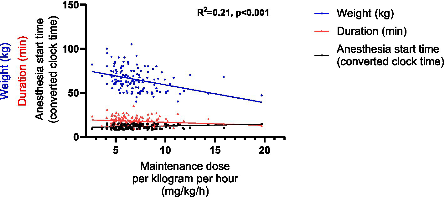A total of 146 cases were included in the statistical analysis. Significant differences were found for all parameters related to propofol dose across the 4 different groups, including induction dose, maintenance dose, total dose and these doses per kilogram per hour. Furthermore, there were positive correlations between the anesthesia start time and all parameters. In the linear regression models, the induction dose equation incorporated the anesthesia start time, age and weight as variables. The model of the maintenance dose per kilogram per hour included the anesthesia start time, duration and weight as variables.