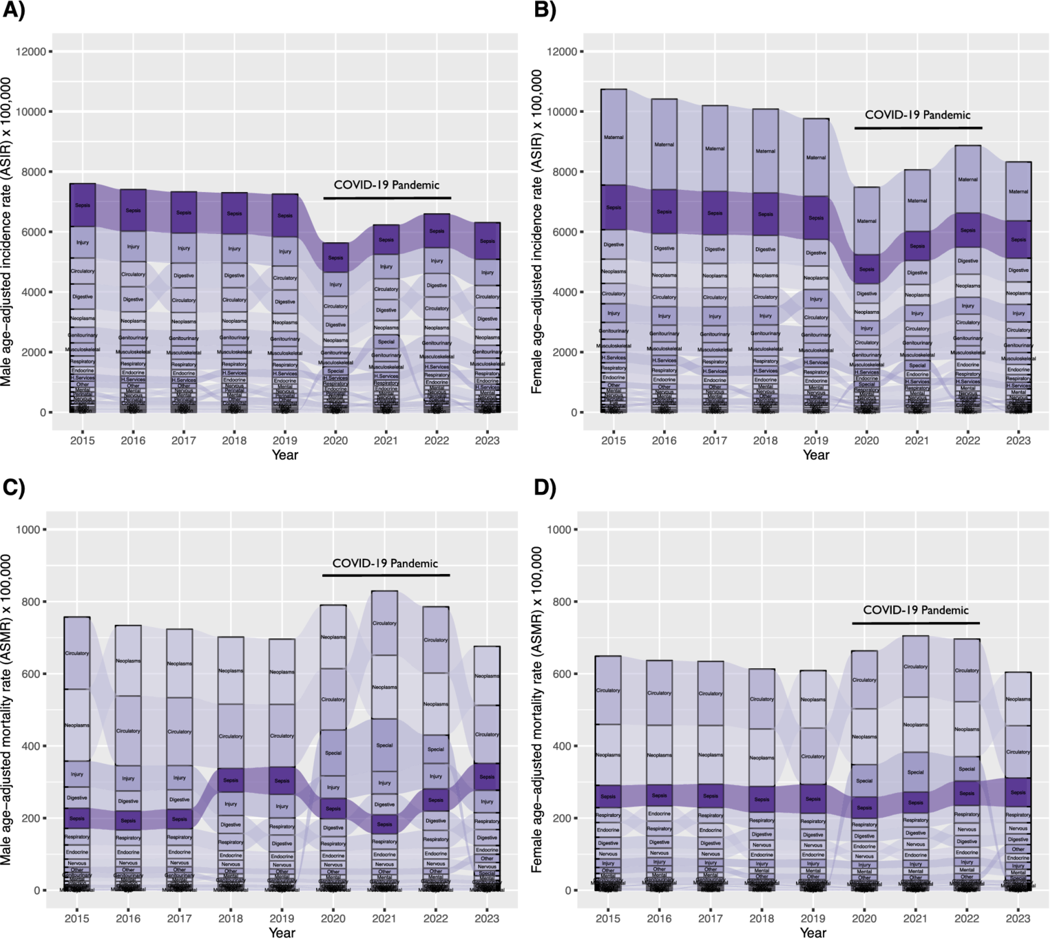 Ranking and progression of sepsis-related age-standardized incidence rate (ASIR) (A), males; (B), females and age-standardized mortality rate (ASMR) (C), males; (D), females), and 22 ICD chapters in Chile from 2015 to 2023.