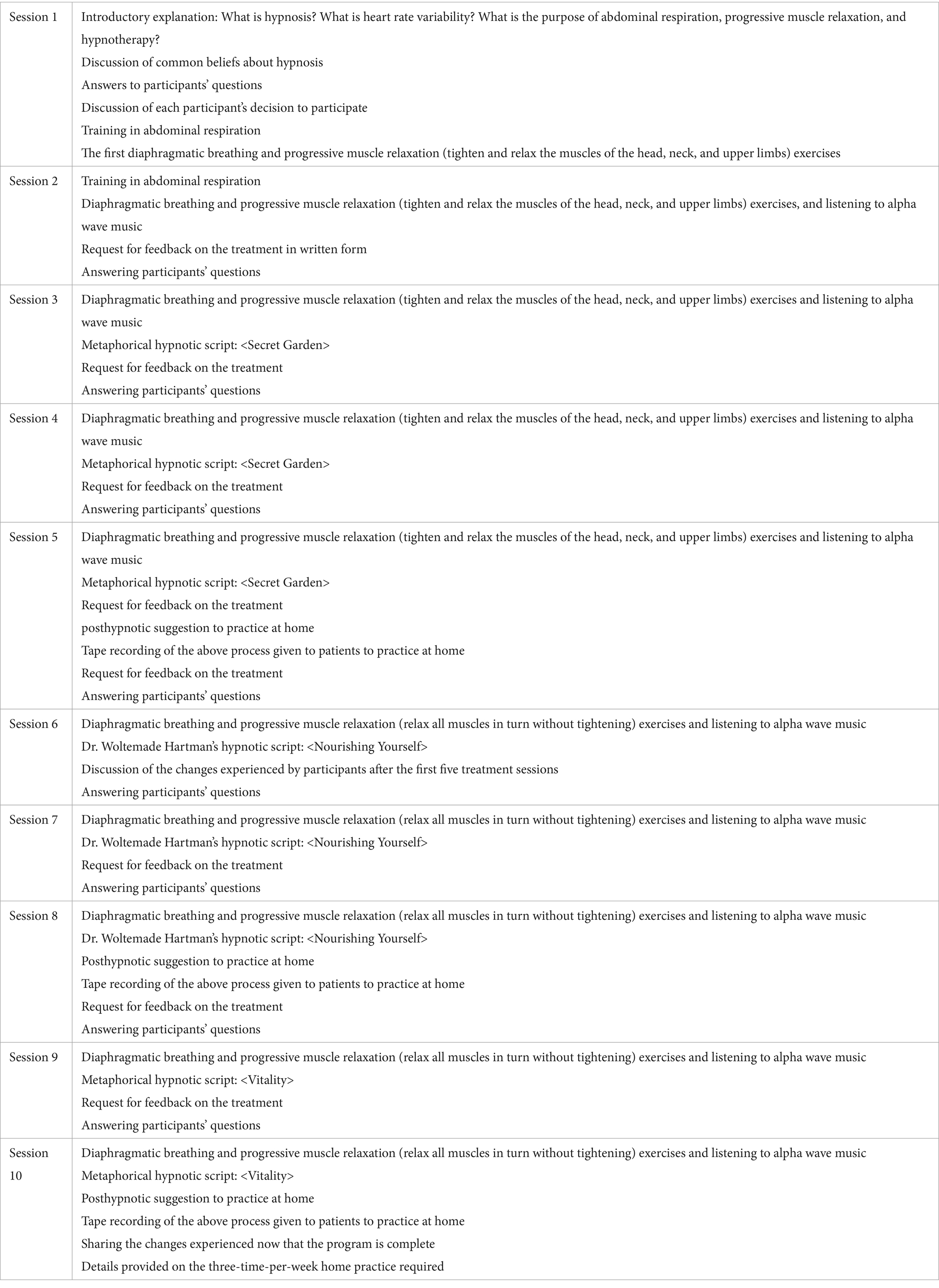 The hypnotherapy intervention was administered in our hospital by a clinician certified through the Germany Hypnotherapy Association with 10 years of perinatal experience. Following a standardized protocol, ten 60-min group sessions (cohort size: 2–4 participants) were conducted (Table 1), comprising (1) the induction phase, (2) therapeutic suggestion delivery, (3) posthypnotic suggestion implementation, and (4) systematic reorientation. Each session included 5-min diaphragmatic breathing training, 10-min modified progressive muscle relaxation (excluding abdominal tension due to pregnancy constraints, focusing on cephalocaudal relaxation without contraction), 5-min alpha music (8–12 Hz frequency), and a 39-min metaphor-based hypnotic narrative. Three evidence-based scripts were used, targeting (1) security priming (“Secret Garden”), drawing on self-security techniques for anxiety disorders (17); (2) resource activation (“Nourishing Yourself”), adapted from Dr. Woltemade Hartman’s resource-oriented hypnotherapy for ego-strengthening (13); and (3) vitality reinforcement (“Vitality”), incorporating nature-based metaphors supported in mind–body interventions during pregnancy (7). Participants received audio recordings for triweekly home practice, with adherence monitored via WeChat. The therapist provided motivational reinforcement for compliance reports. Both groups received treatment-as-usual (TAU): psychoeducation on perinatal mood disorder impacts and evidence-based wellness strategies.