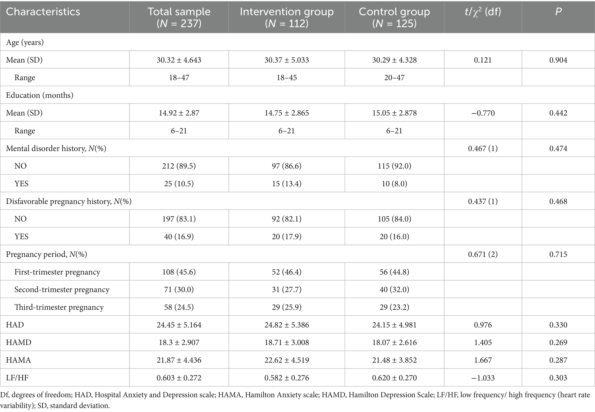 We enrolled 237 participants (intervention: n = 112; control: n = 125). Baseline characteristics, including age, education level, mental disorder history, adverse pregnancy history, gestational age, HADS, HAMD, HAMA, and LF/HF ratio, showed no significant differences between groups (all p > 0.05; Table 2).