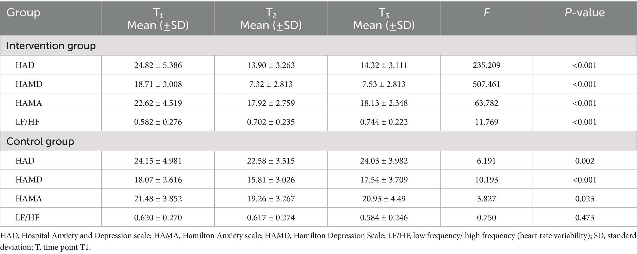 Table 3. Intragroup differences in HAD, HAMD, and HAMA scale scores and the LF/HF ratios between the three time points for the control and intervention groups.