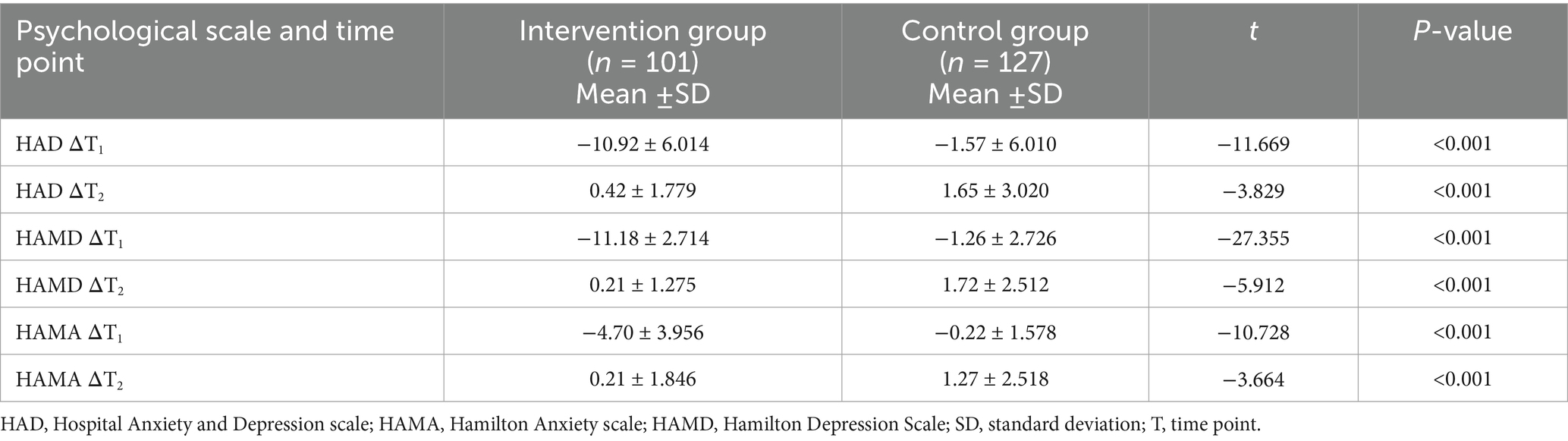 Table 4. Between-group comparison of the changes in the HAD, HAMD, and HAMA scale scores between the three time points for the control and intervention groups.