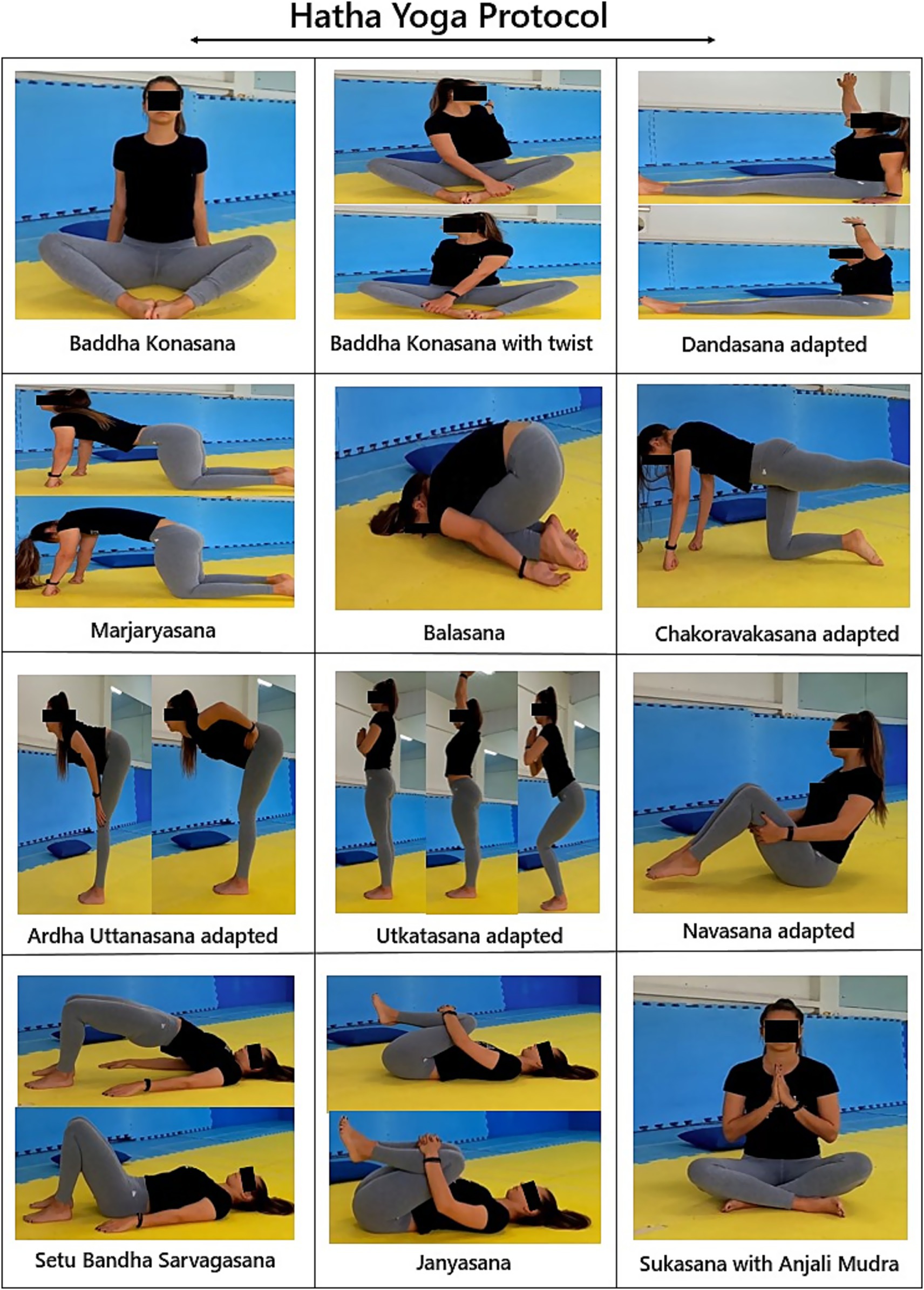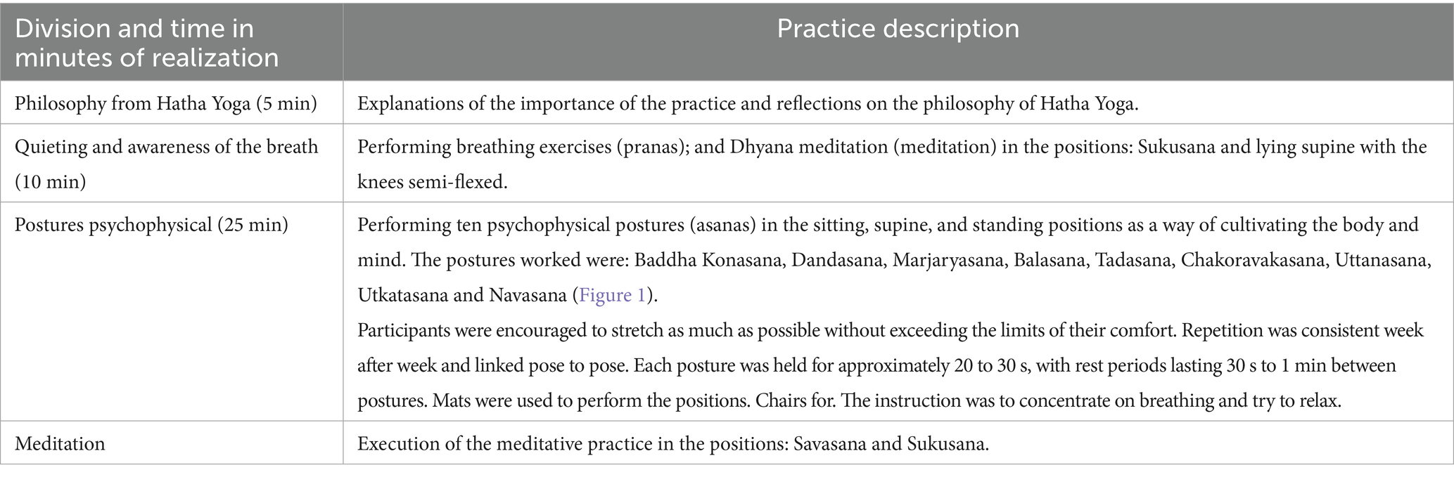 The ability to complete the intervention was characterized by the ability to perform the postures and movements during the Hatha Yoga intervention and by the need to adapt or modify postures. These aspects were monitored and recorded by the professional present at the sessions.