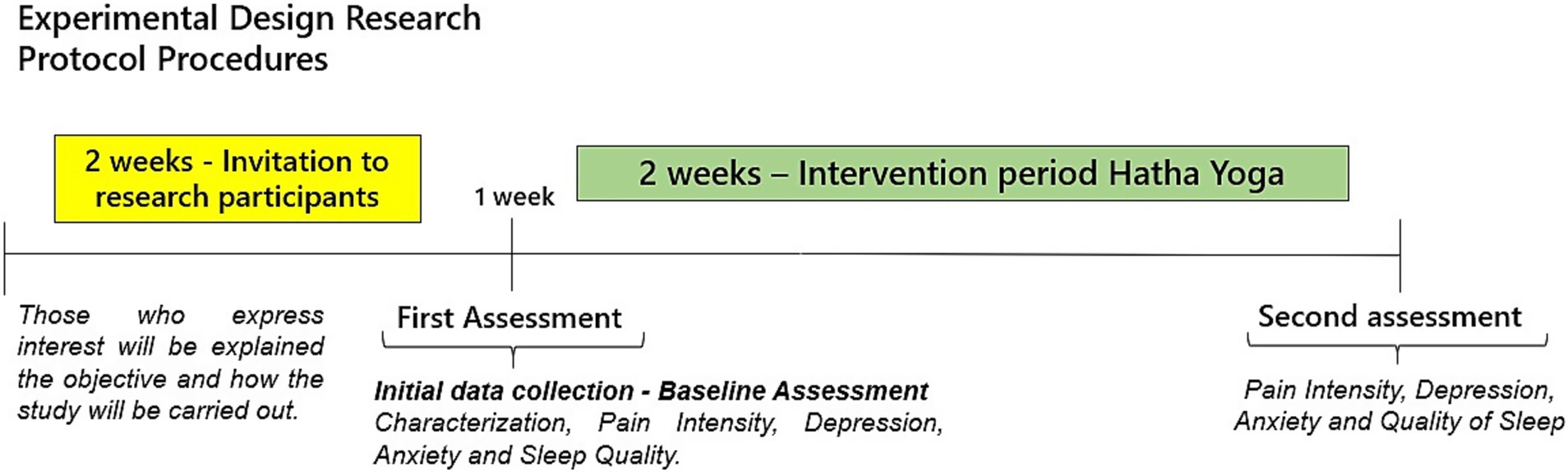 The stages of data collection are described in Figure 2. The outcomes evaluated before and after the intervention were: Pain Intensity, Depression, Anxiety, and Sleep Quality. Feasibility measures were also evaluated: adverse effects/safety, acceptability, ability to complete the intervention, and external interference from other physical activities.