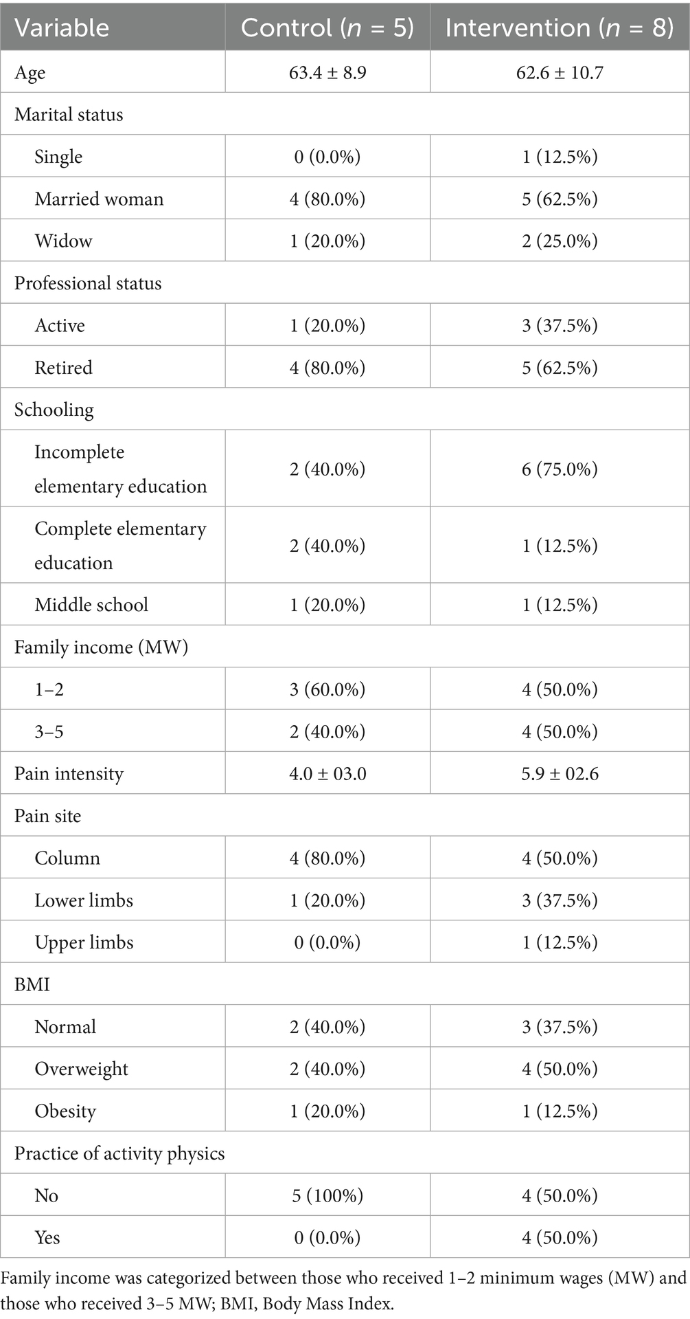 Thirteen women participated in the study, distributed into an intervention group (n = 8) and a control group (n = 5). The sociodemographic and clinical characteristics at baseline are described in Table 2. The age of the participants ranged from 47 to 77 years (62.9 ± 9.3). The participants were predominantly retired (69.2%), with low education (only 2 participants completed high school), and with a family income of less than or equal to 5 minimum wages. The most commonly reported primary sites of pain by the participants were the lower limbs and spine. Mean pain intensity ranged from 1 to 9, with a mean score of 5.2 (± 2.8). Participants in the Hatha Yoga group tended to have lower mean pain scores than those in the control group. Approximately 50% of the intervention group participants were physical activity practitioners, while none of the women in the control group performed physical activity.