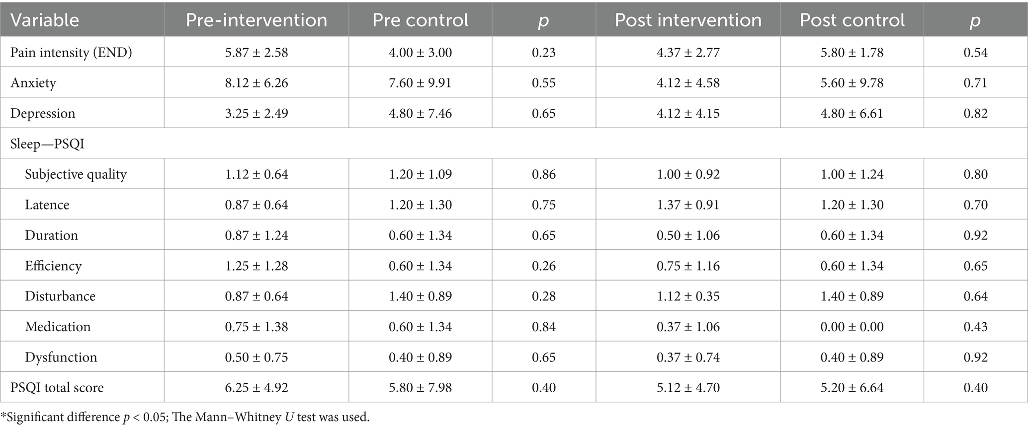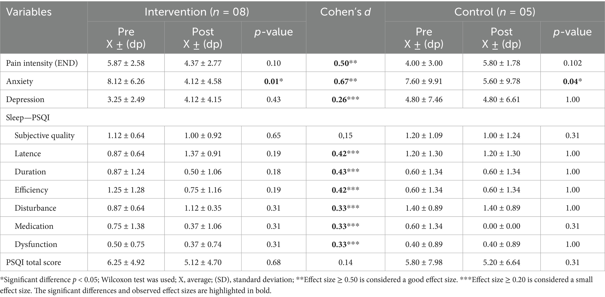 In the intragroup comparison, there was a significant improvement in the anxiety status of the intervention group, when comparing pre and post-test, with a p-value of less than 0.01 (and an intervention effect size of moderate to large). Although pain intensity did not present significant differences, there was a 1.5 reduction in mean values (moderate effect size). There were no significant differences in the sleep quality of the two groups after 2 weeks of Yoga (post-test) (Table 3). On the other hand, based on the results of the mean values and the effect size presented, there was an improvement in the overall sleep quality on the PSQI and the intervention group depression.