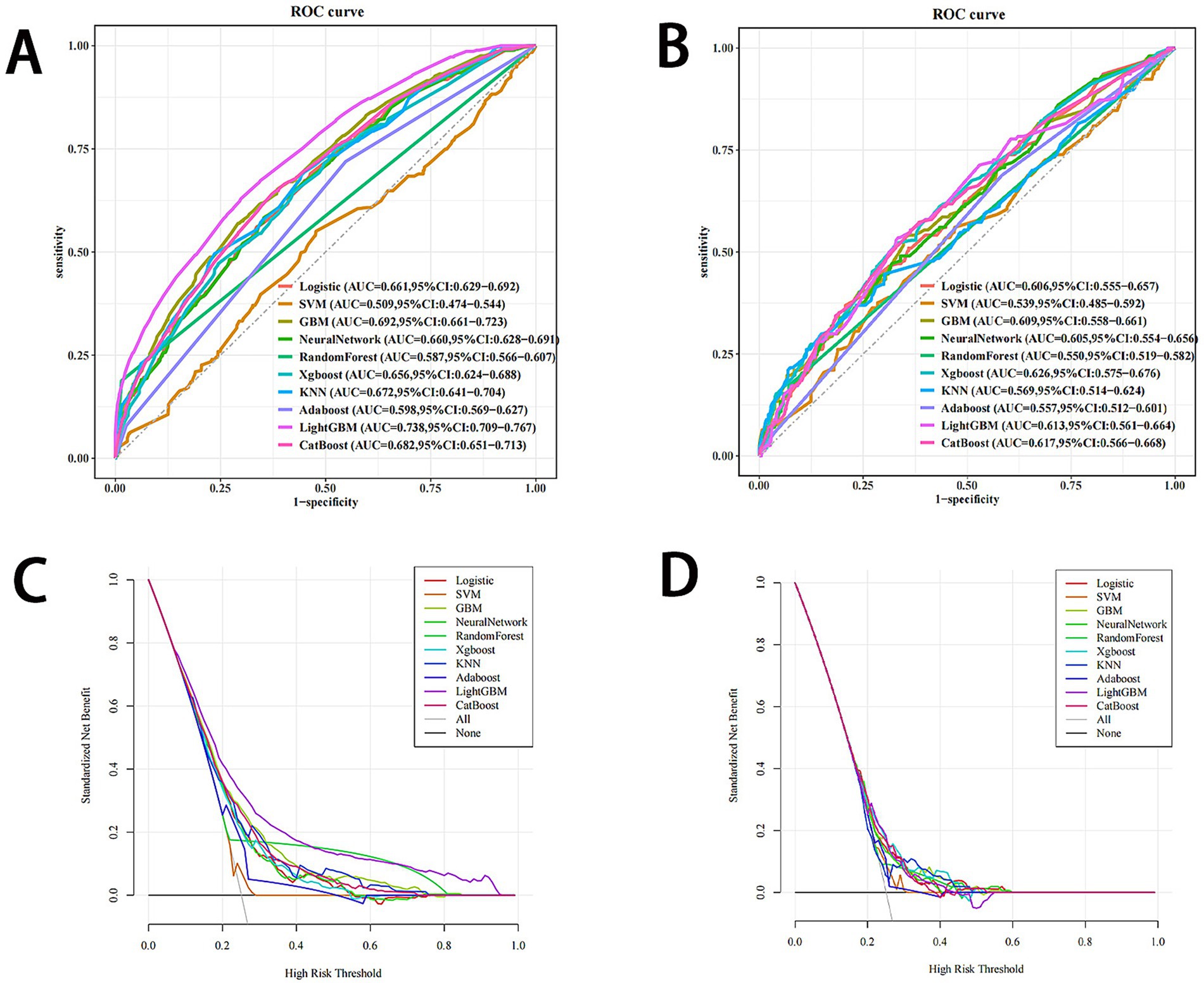 Figure 1. Comprehensive evaluation of machine learning models. (A) ROC curves and AUC values of the training set. (B) ROC curves and AUC values of the testing set. (C) Decision curve analysis of the logistic, SVM, GBM, neural network, Xogboost, KNN, Random forest AdaBoost, LightGBM, and CatBoost models in the training set. (D) Decision curve analysis of the logistic, SVM, GBM, neural network, Xogboost, KNN, Random forest AdaBoost, LightGBM, and CatBoost models in the testing set. ROC, receiver operating characteristic; AUC, area under the receiver operating characteristic curve; logistic, logistic regression; VM, support vector machine; GBM, gradient boosting machine; Xgboost, extreme gradient boosting; KNN, k-nearest neighbors; AdaBoost, adaptive boosting; LightGBM, light gradient boosting machine; CatBoost, categorical boosting.