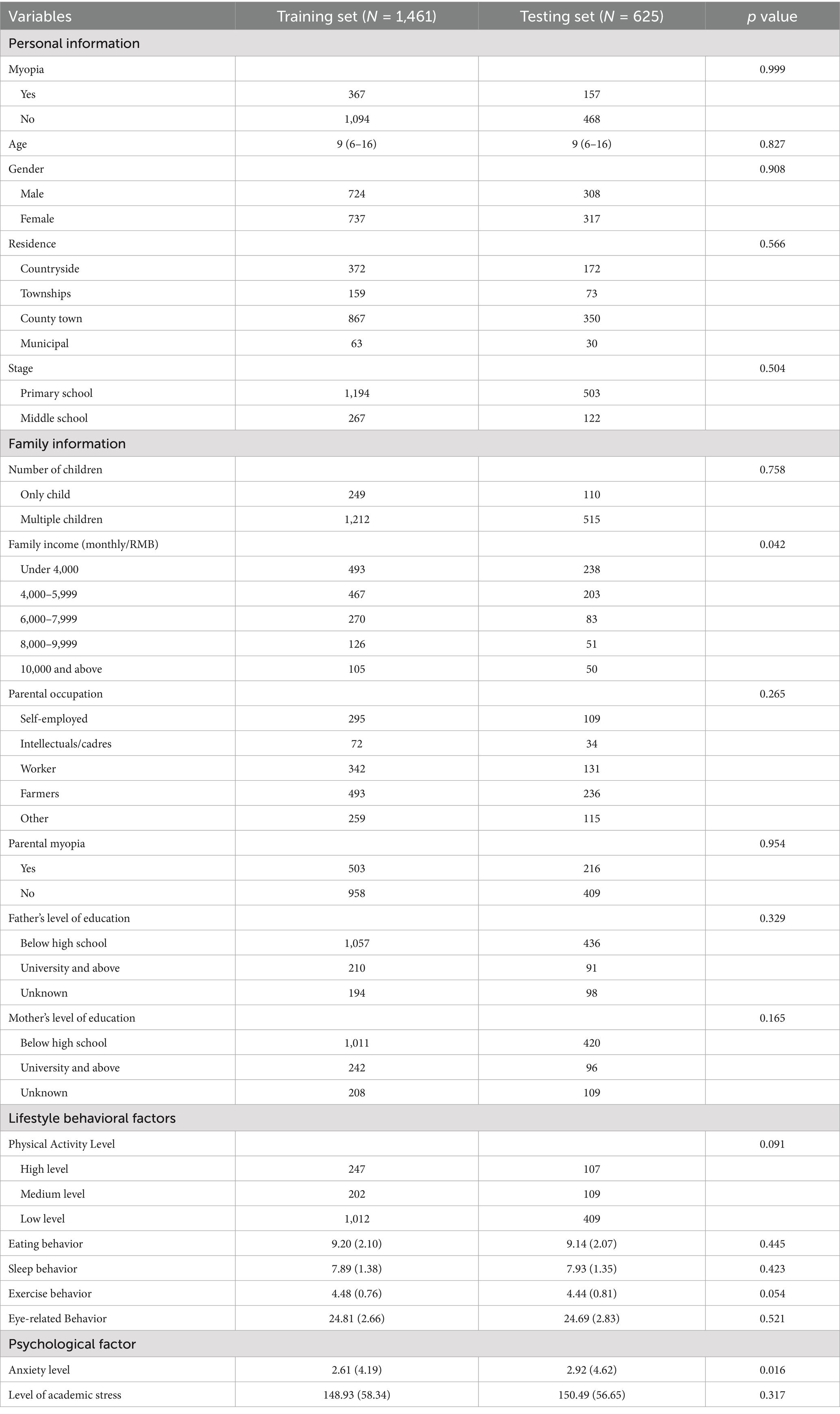 In this study, a questionnaire was used to collect student information. Prior to completing the questionnaire, the researchers provided instructions on how to fill it out, and the class teachers supervised the completion and collection of the questionnaires to ensure their quality. A total of 2,112 participants’ data were collected. During the data preprocessing process, blank samples were removed, and missing values in some samples were filled in. Ultimately, 2,086 samples were retained. The dataset was then divided into a training set (n = 1,461) and a test set (n = 625) at a 7:3 ratio.