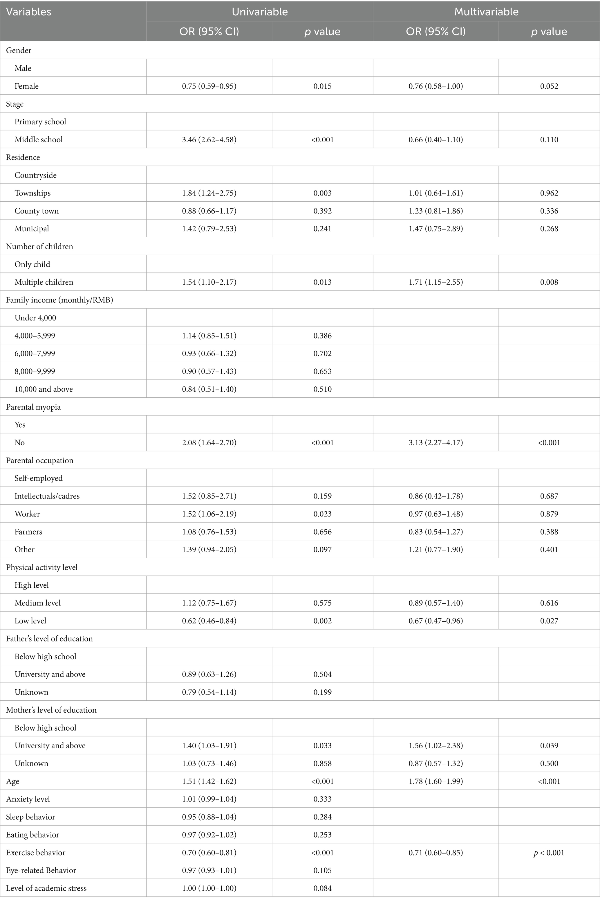 This study included 2,086 children and adolescents aged 6 to 16 years. The results revealed that the overall myopia rate among students was 25.12%, of which 55.4% were boys and 44.6% were girls. The results revealed that the overall myopia rate among students was 25.12% with notable differences between middle school students (85.24%) and primary school students (25.52%). This finding further confirms the high incidence of myopia among children and adolescents in recent years, particularly among middle school students (25, 26). Additionally, physical activity level, anxiety level, and academic pressure have been identified as important factors influencing myopia risk (15, 27, 28). Our data show that children and adolescents generally have low levels of physical activity, along with high levels of anxiety and academic pressure, which is consistent with studies both domestically and internationally (29). These results suggest that the health behaviors, psychological state, and academic pressure of children and adolescents are closely related to the onset of myopia, highlighting the importance of early and comprehensive intervention strategies.