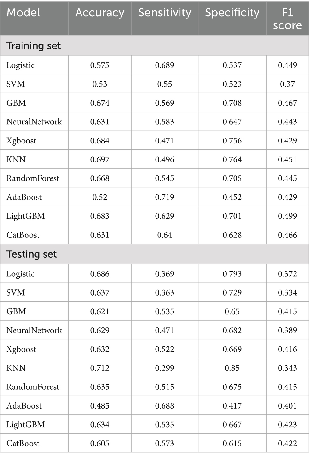 In addition, the five performance metrics for the LightGBM model in the training set were as follows: accuracy = 0.683, sensitivity = 0.629, specificity = 0.701, F1 score = 0.499, as shown in Table 3. In the testing set, the five performance metrics for LightGBM were as follows: accuracy = 0.634, sensitivity = 0.535, specificity = 0.667, F1 score = 0.423. Overall, the LightGBM model exhibited the best performance.