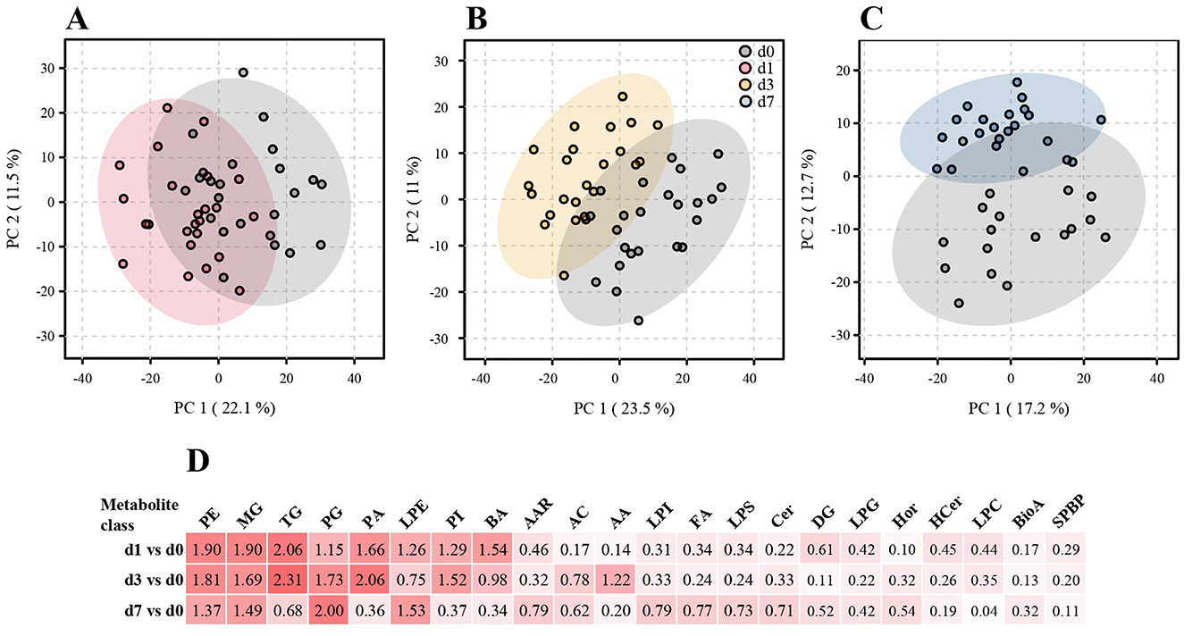 Euclidian distance analysis supported the above notion that the greatest changes in metabolite populations occurred by d1 and d3, whereby the greatest changes were seen in LPE, PE, TG, MG, PC, PA, LPC, and bile acids (Figure 1D). The latter stood out in that there was a marked increase in variance on d1, which decreased by d3 and essentially normalized by d7. Nonetheless, several metabolite classes showed the largest Euclidian distance on d7. These were characterized by, overall, moderate Euclidian distances on d1 and d3 (e.g., LPI, FA, LPS, Cer), underscoring the differences in metabolite populations on day 7 compared to d1 and d3.