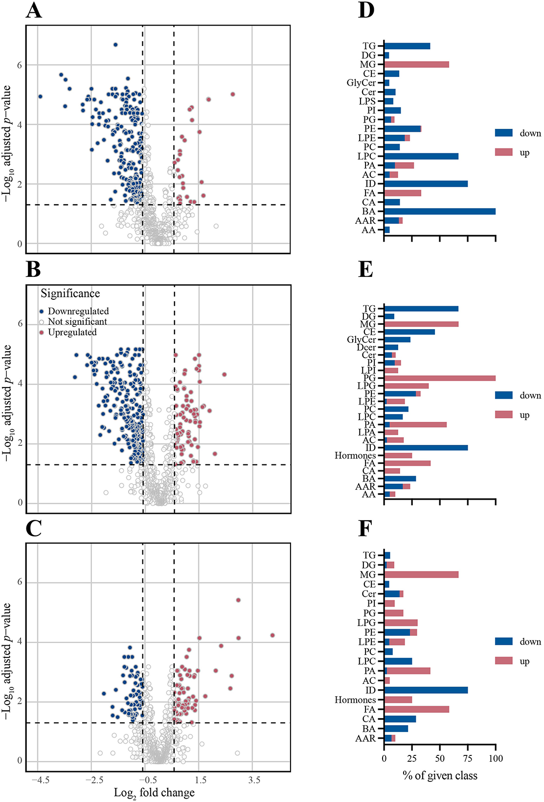 Figure 3. Differential abundance analysis based on the same metabolites as Figure 1 reveals a shift from down- to upregulation during post-operative recovery. Differentially abundant (FC ≥|1.5|, FDR < 0.05 Wilcoxon rank-sum test) metabolites with respect to d0 are indicated for each time point post-op. For each day, a volcano plot indicating differential abundance of individual metabolites and a bar chart indicating the direction of abundance change in each metabolite class are shown. Blue bars = downregulation; red bars = upregulation. (A, D) d1. (B, E) d3. (C, F) d7 and n = 24 (d0); 24 (d1); 24 (d3); 20 (d7).