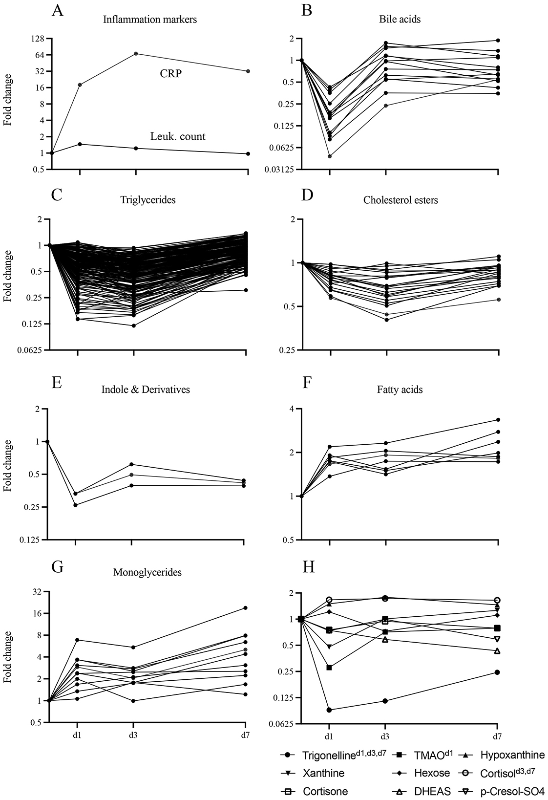 Figure 4. Kinetics of concentration changes in selected metabolite classes and blood inflammatory parameters throughout the time course. Concentration dynamics are expressed as fold change with respect to d0. The y-axis label “Fold change” also applies to panels (B, D, F, H). (A) Blood CRP and leukocyte count. (B–H) Plasma metabolites. (B–E) Selected predominantly downregulated metabolite classes (bile acids n = 13, triglycerides n = 238, cholesterol esters n = 22, indoles and derivatives n = 3). (F, G) Selected predominantly upregulated metabolite classes (fatty acids n = 8, monoglycerides n = 11). (H) Selected individual metabolites of interest [cortisol, cortisone, dehydroepiandrosterone sulfate (DHEAS), hexoses, hypoxanthine, p-cresol-SO4, trigonelline, trimethylamine N-oxide (TMAO)]. Days on which fold change was significant with respect to d0 are indicated as superscripts. n = 24 (d0); 24 (d1); 24 (d3); 20 (d7).