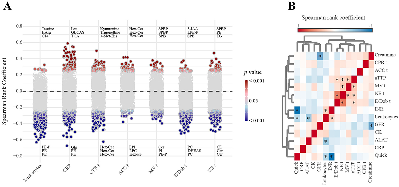 Figure 5. Correlations between intra-operative parameters, inflammation markers, and metabolites, based on Spearman rank coefficients. (A) Correlation with metabolites, pooled analysis of data from all three time points combined. Each circle indicates one metabolite. Labeled metabolites represent the ones with highest correlation coefficient. Gray fill color = p > 0.05. (B) Correlations among intra-operative parameters (n = 5), inflammation markers (n = 2), and clinical chemistry parameters (n = 6). * = p < 0.05. p values based on FDR obtained with t-test. n = 24 (d0); 24 (d1); 24 (d3); 20 (d7).