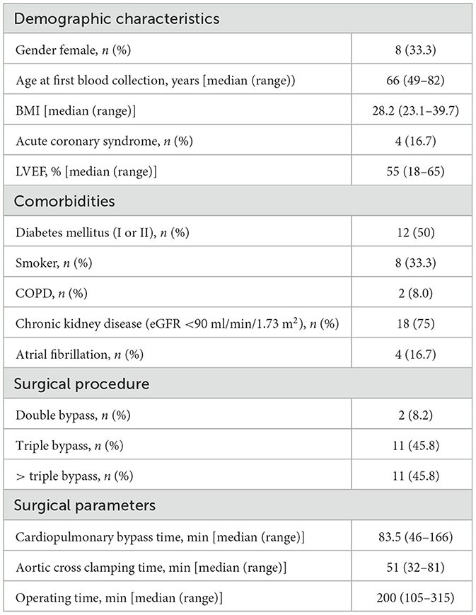 This prospective study was approved by the Ethics Committee of Otto-von-Guericke-University Hospital (OVGU), Magdeburg, Germany (file no. 183/19), which is in accordance with the ethical principles of the Declaration of Helsinki. After giving informed consent, CAD patients number (N) = 24 from the Department of Cardiothoracic Surgery at OVGU were enrolled in 2023, all undergoing elective on-pump CABG. Among them, n = 3 (12.5%) had two vessel disease, and n = 21 (87.5%) had three vessel disease. The study did not include single vessel CAD patients. Inclusion criteria were (i) adults >18 years of age and (ii) elective on-pump CABG. Exclusion criteria were (i) intake of immunosuppressive medication, (ii) viral hepatitis or HIV infection, and (iii) anemia with hemoglobin < 7 mmol/L. All patients underwent the same standardized protocol for anesthesia (≥8 h no food and ≥2 h no beverage intake before surgery, general anesthesia with propofol, rocuronium and sufentanil), perfusion, and surgery. All patients resumed oral food intake on post-operative day 1 except for two patients who developed a complicated clinical course.