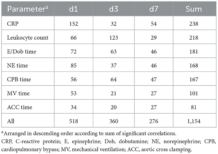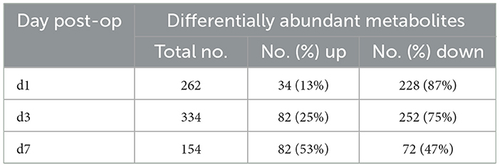 Results: Out of 1,019 detectable analytes, 970 passed the quality screen and were included in the analysis. With respect to d0, the greatest degree of change in metabolite populations occurred by d1, but substantial changes persisted through d7. Metabolites could be classified into those which were predominantly downregulated (e.g., triglycerides, bile acids, cholesterol esters, lysophosphatidylcholines, indoles and derivatives), up- or downregulated (e.g., phosphatidylinositol, phosphatidylethanolamines, phosphatidic acids, ceramides), or upregulated (free fatty acids, monoglycerides). Concentrations of food- and/or microbiota-derived metabolites (indole derivatives, trimethylamine N-oxide, trigonelline) were markedly reduced, particularly on d1 and d3. Changes in metabolite concentrations correlated most strongly with plasma C-reactive protein concentration (r = −0.67 to 0.59) and blood leukocyte count (−0.63 to 0.32) and less with intra-operative (−0.62 to 0.50) and ICU care (−0.52 to 0.38) parameters. Of note, neither C-reactive protein (CRP) nor leukocyte count correlated significantly with an intra-operative or ICU parameter.