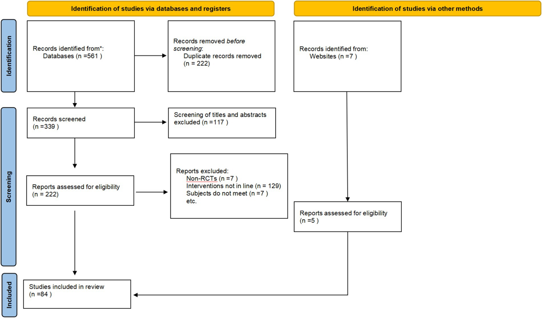 Flowchart of a study selection process. It starts with 561 records identified from databases and 7 from websites. After removing 222 duplicates, 339 records are screened, with 117 exclusions. 222 reports are assessed for eligibility, and 148 are excluded for reasons like non-RCTs or unsuitable interventions. Finally, 84 studies are included in the review.
