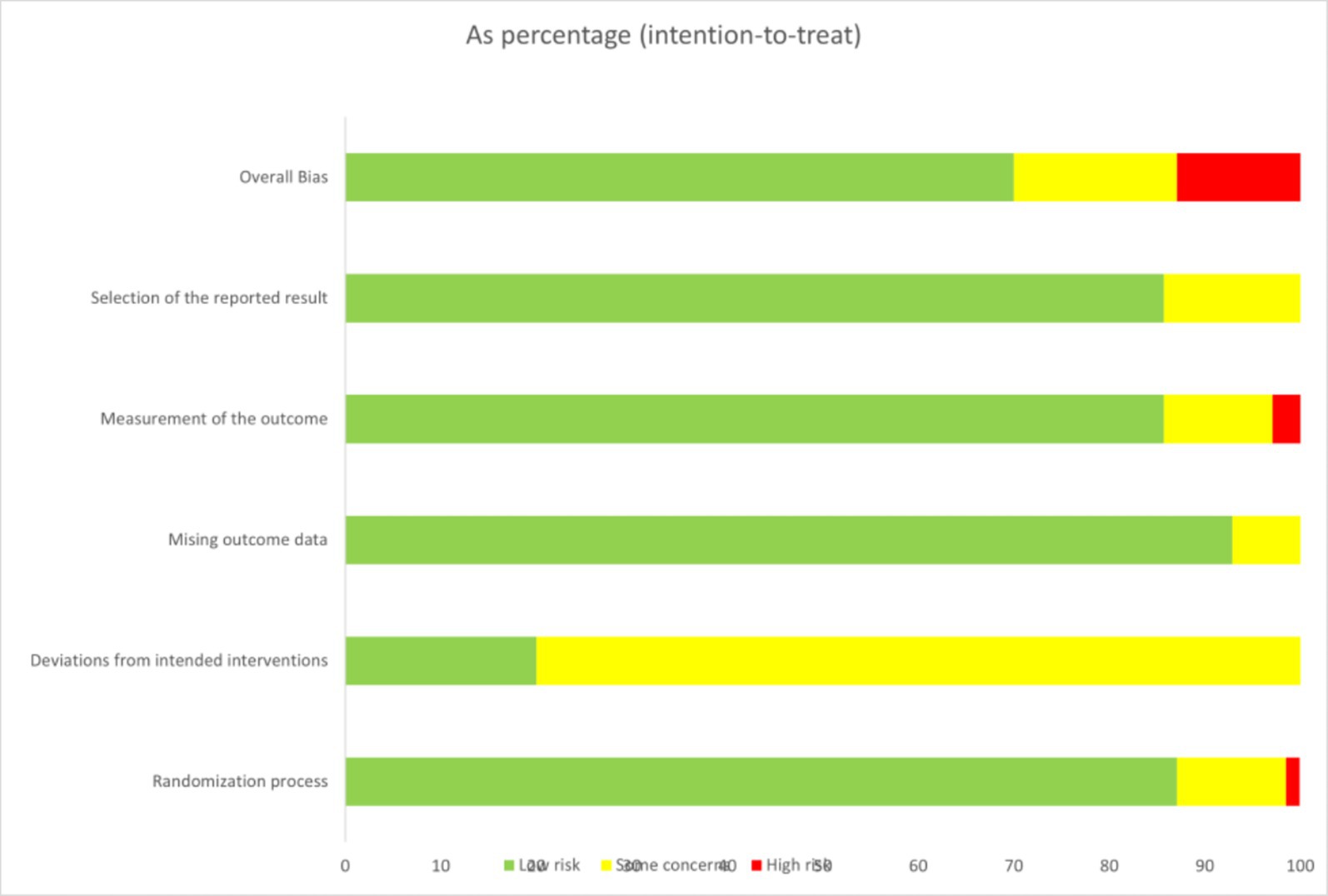 Bar chart depicting risk assessment of various factors in research methodology, shown as percentages. Categories include randomization process, deviations, missing data, measurement, result selection, and overall bias. Color-coded for low risk in green, some concern in yellow, and high risk in red.