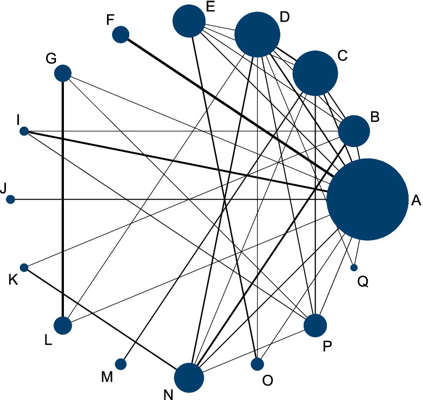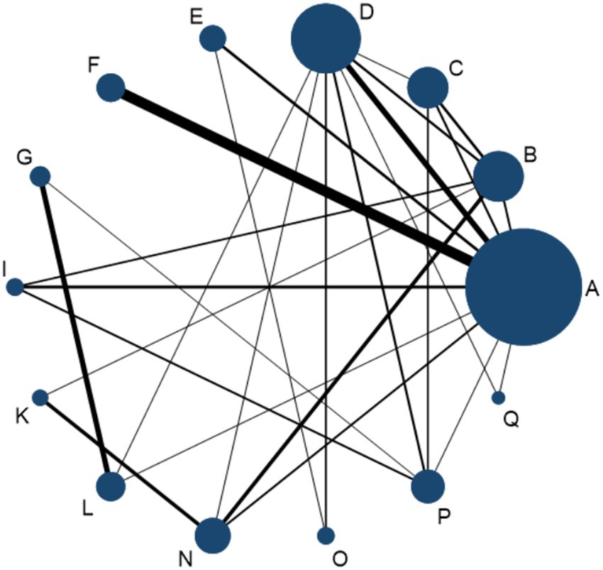 Network diagram illustrating nodes labeled A through Q, connected with varying line thickness. Node A is the largest, indicating higher connectivity. Thicker lines denote stronger connections, notably between A, F, and D.