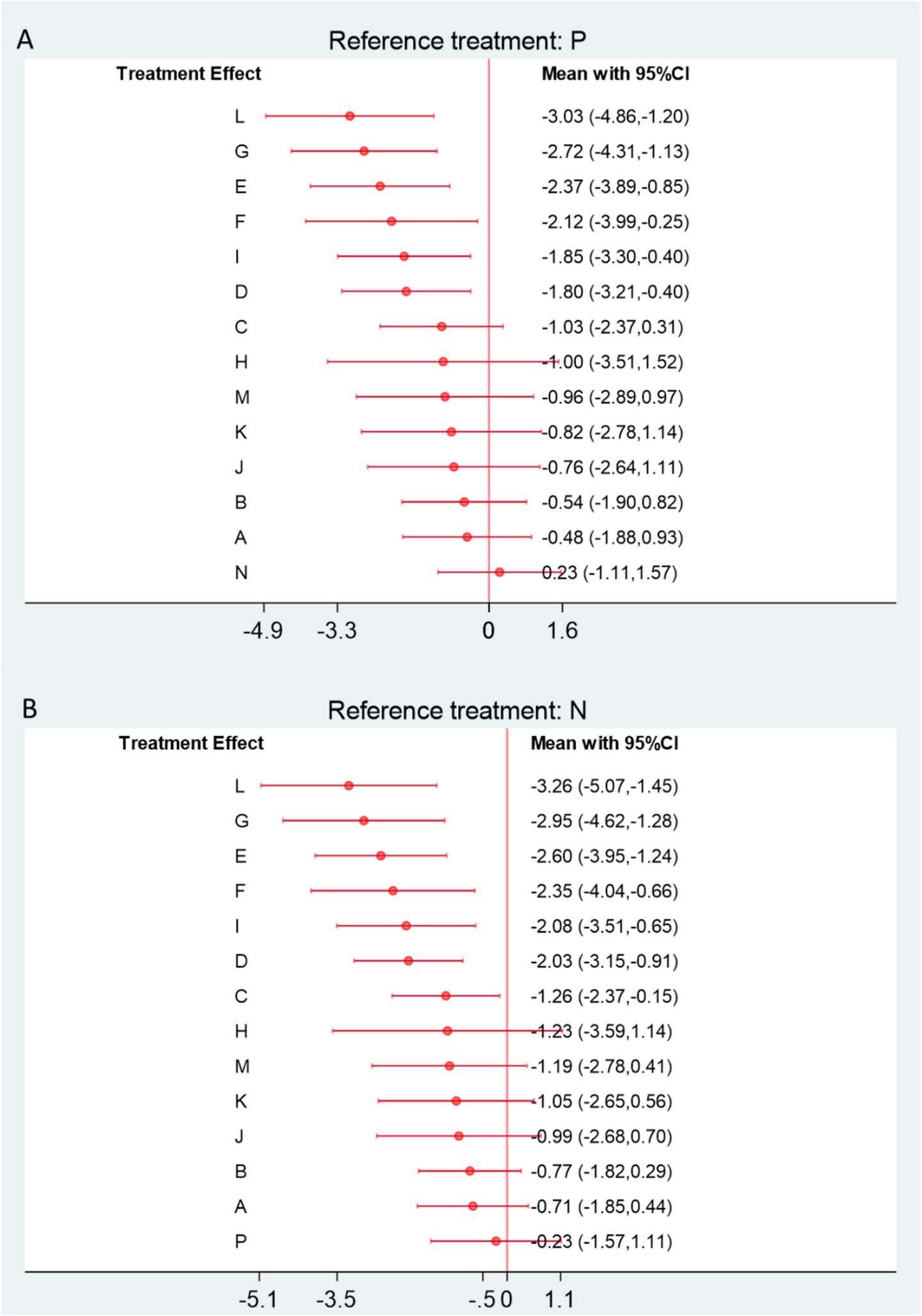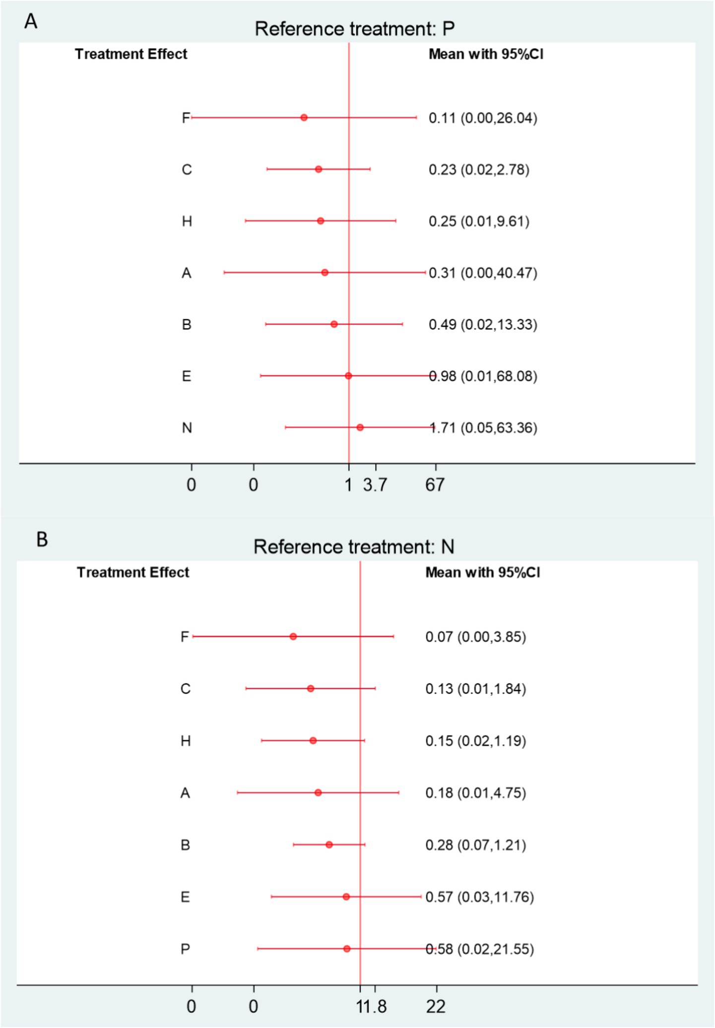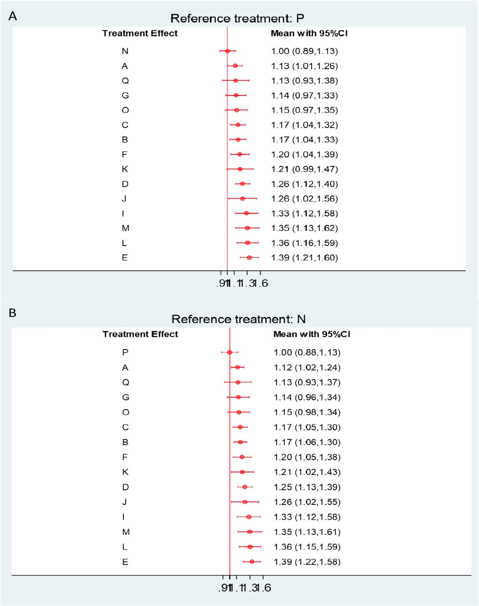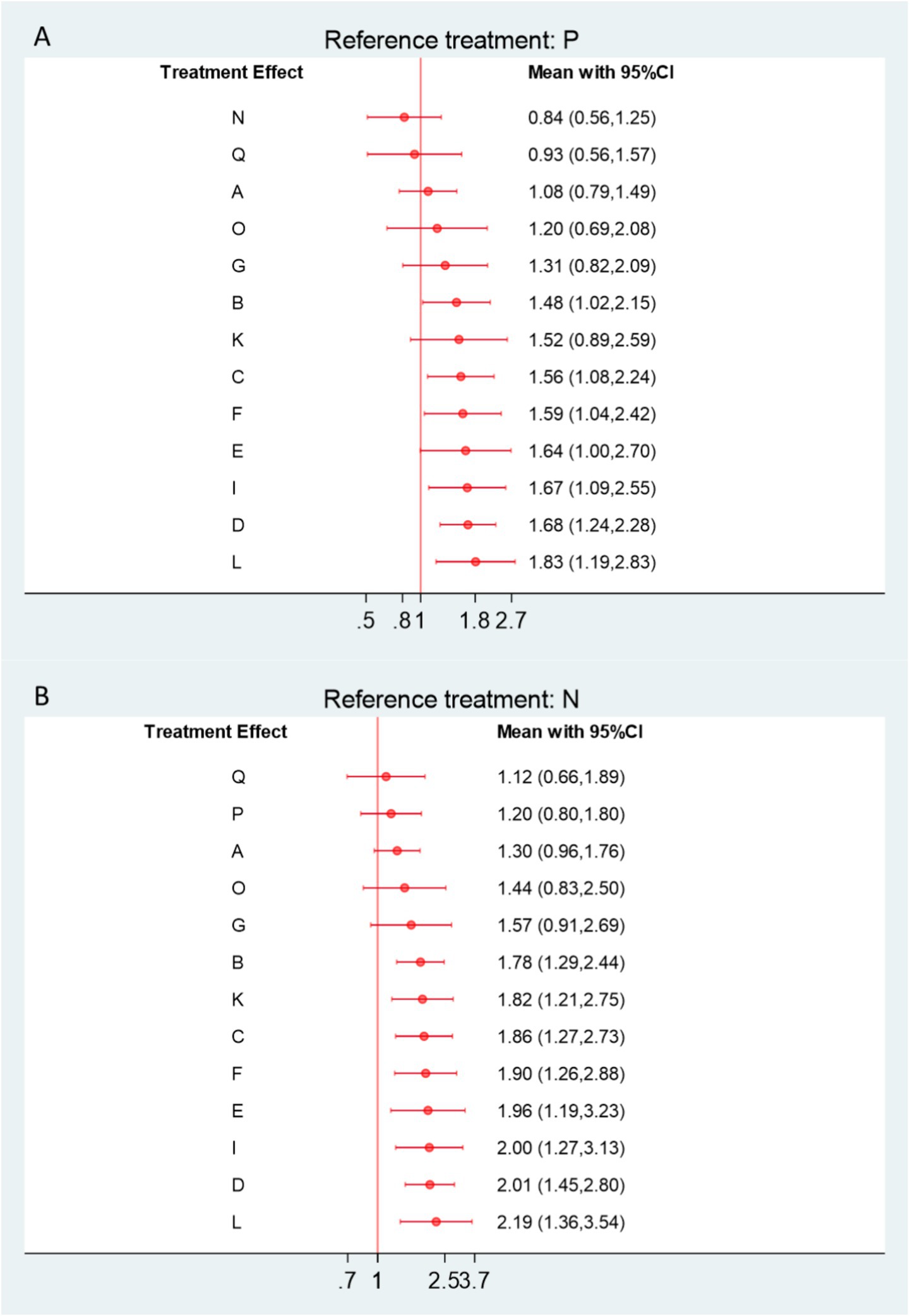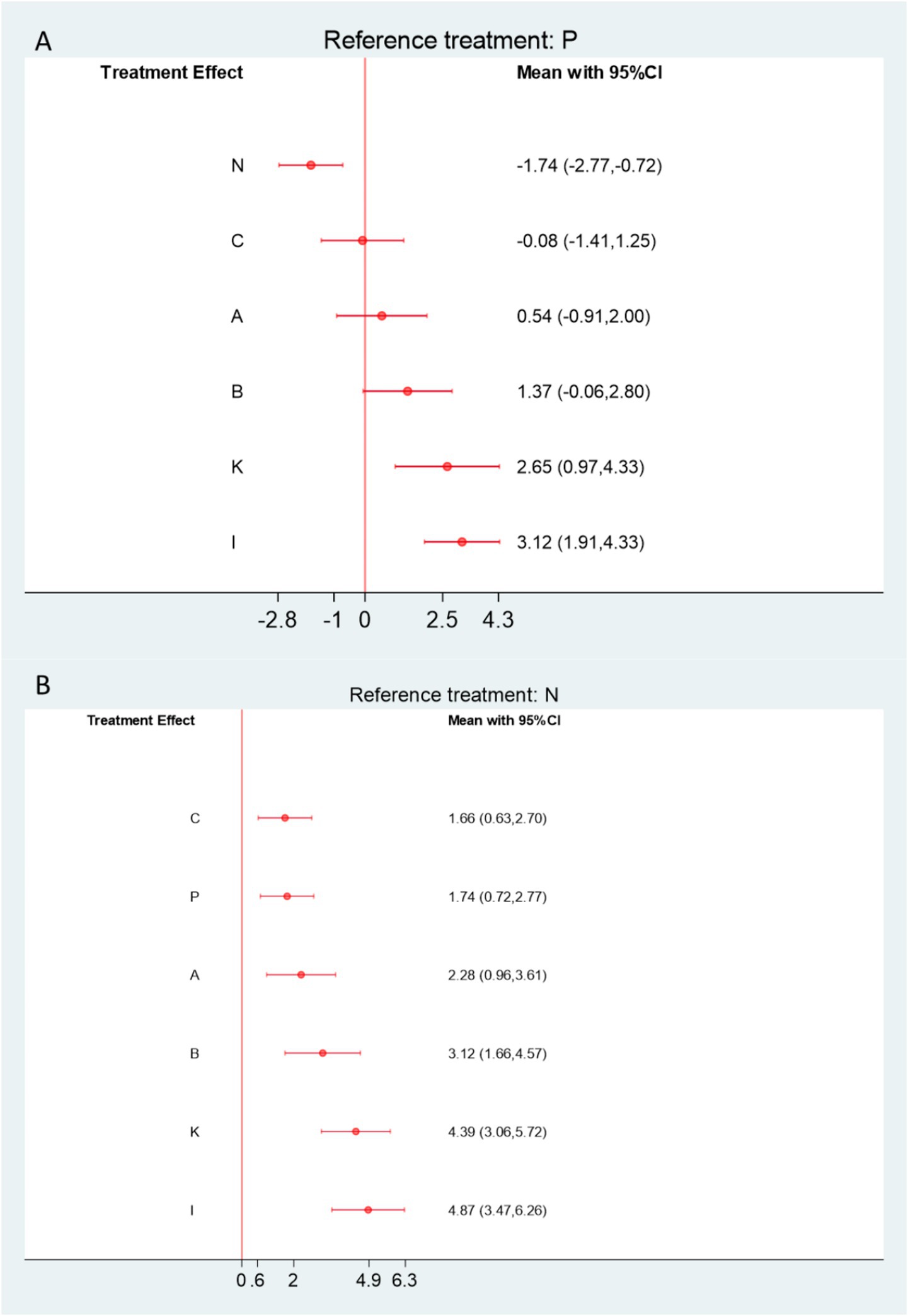 Two forest plots, labeled A and B, compare treatment effects. Plot A uses reference treatment P, showing various treatments with mean effect sizes and confidence intervals. Plot B uses reference treatment N, presenting similar data for the same treatments. Each plot features horizontal lines representing confidence intervals for each treatment effect around a central red vertical line.