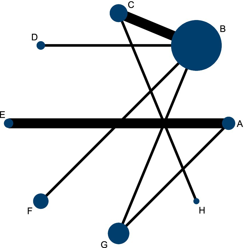 This NMA evaluated improvements in overall effectiveness rate across 68 RCTs involving 6,536 participants. As shown in Figure 3, the network included both direct and indirect comparisons between acupuncture-related interventions and control treatments—physical therapy (P) and Western medicine (N). The thickness of each connecting line in the network plot indicates the frequency of direct comparisons, with acupuncture combined with cupping (F) and Western medicine (N) appearing most frequently.