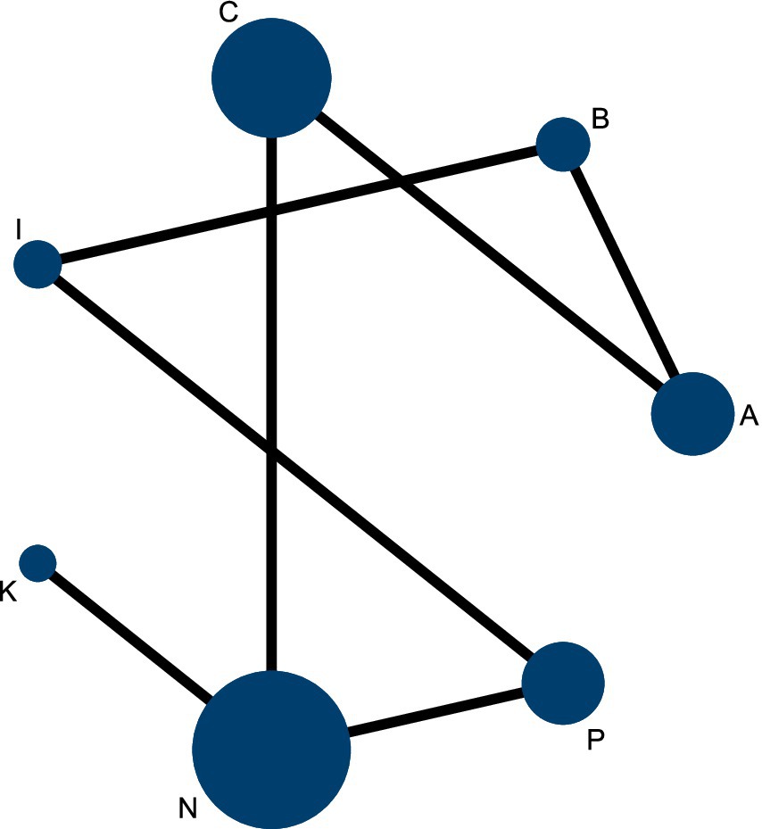A graph with blue nodes labeled A, B, C, I, K, N, and P interconnected by black lines of varying lengths. Node sizes differ, with N being the largest.