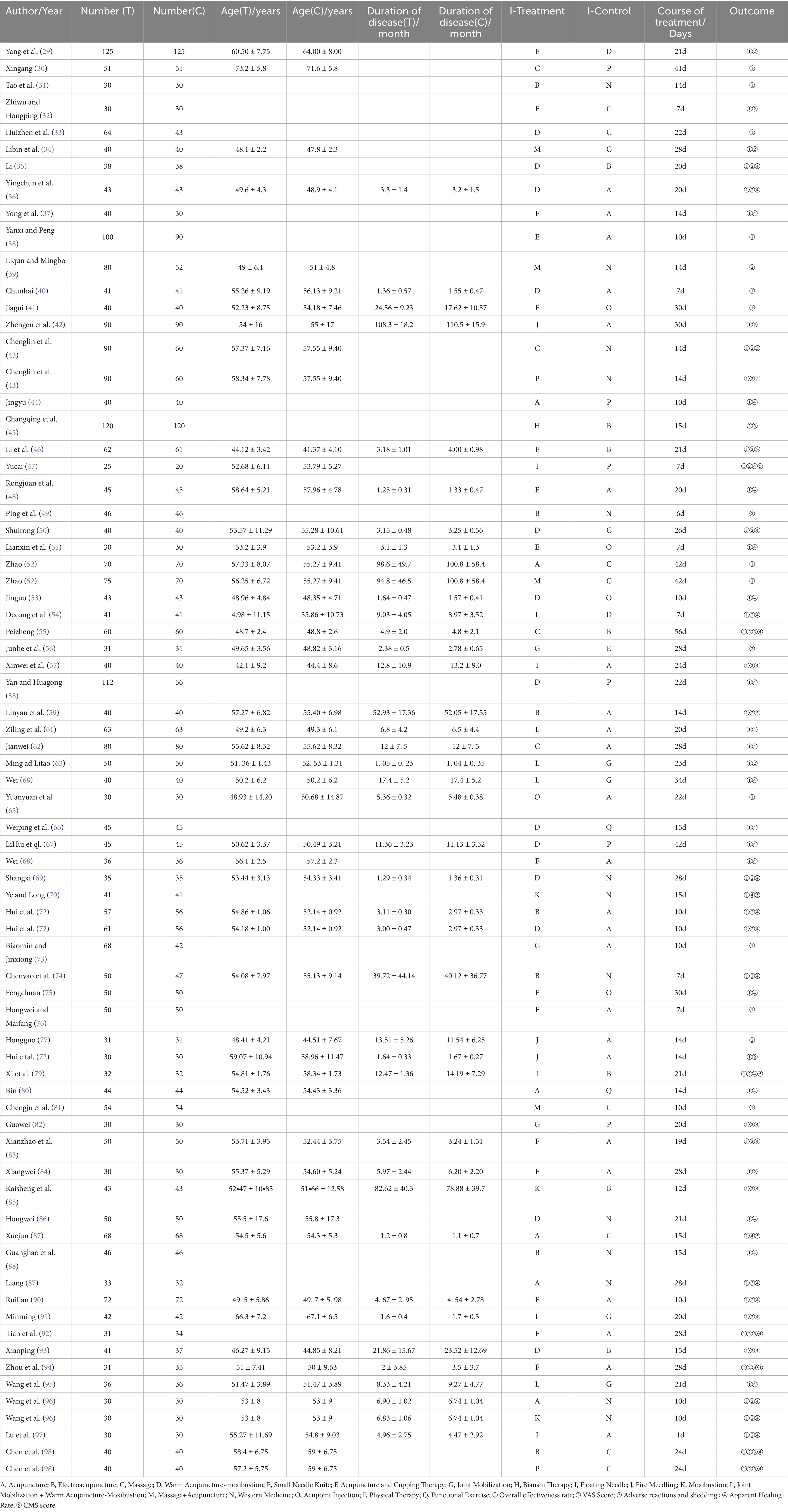 A total of 84 RCTs (2795) involving 7,125 participants were included, comprising 3,677 patients in the intervention groups and 3,448 in the control groups. Sample sizes across studies ranged from fewer than 30 to more than 200 participants per trial. The mean age of participants was generally between 40 and 65 years, with several studies reporting elderly cohorts above 70 years. Most participants had a disease duration of within 1 year, while a small number of patients had a disease history of more than 5 years. The interventions covered 17 types of acupuncture-related therapies, including manual acupuncture, electroacupuncture, moxibustion, warm acupuncture–moxibustion, fire needle, floating needle, small needle knife, Bianshi therapy, acupuncture combined with cupping, massage combined with acupuncture, and joint mobilization alone or in combination with acupuncture-related techniques. Control groups primarily received Western medicine or physical therapy, though several studies also compared different acupuncture modalities directly. Treatment duration ranged from 1 to 90 days, with most trials administering interventions over 14–28 days (Table 1).