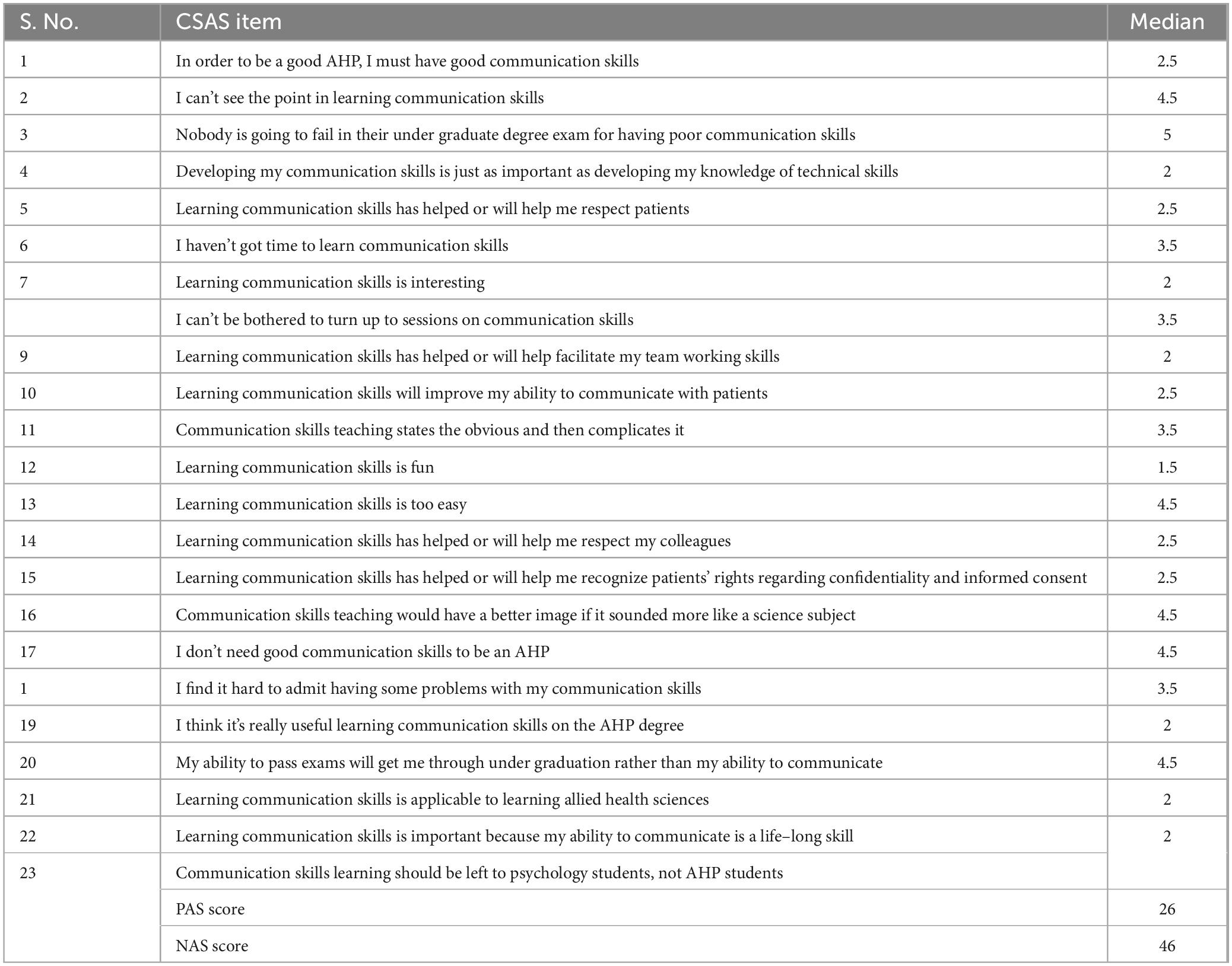 9. Rees C, Sheard C, Davies S. The development of a scale to measure medical students’ attitudes towards communication skills learning: the Communication Skills Attitude Scale (CSAS). Med Educ. (2002) 36:141–7. doi: 10.1046/j.1365-2923.2002.01072.x