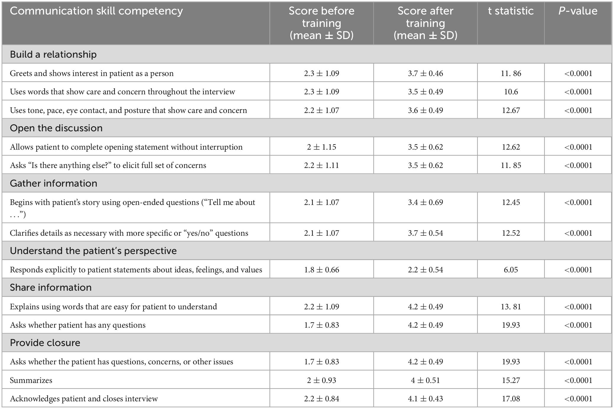 Higher scores were found in various communication skill competencies in the modified KEECC checklist after delivery of the training module as indicated by significant p-values after applying the paired t-test as shown in Table 2.