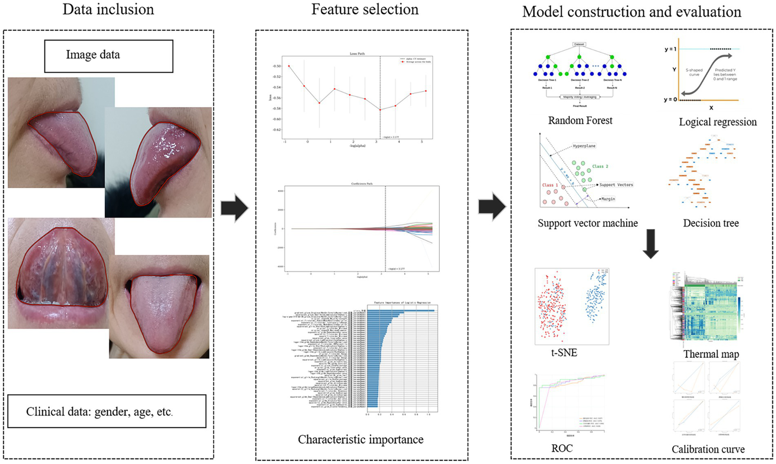 All tongue images were in PNG format. Images were imported into the Beijing Yizhun AI Darwin Research Platform, and the region of interest (ROI) was manually delineated by an experienced TCM practitioner and independently reviewed by a senior practitioner (20 years of experience). The image standardization was ensured by size normalization and color correction; the tongue features were normalized by maximum absolute value normalization; and the minimum redundancy maximum relevance (mRMR) (18) method was employed for feature selection, an advanced filter-based feature selection technique that goes beyond conventional dimensionality reduction. This method aims to identify a subset of features from the initial 1,125-dimensional space that maximizes relevance to HT status while minimizing inter-feature redundancy. By balancing discriminative power and redundancy, the mRMR algorithm effectively reduces the risk of overfitting inherent in high-dimensional datasets, thereby improving model performance and generalizability. The preprocessed tongue image dataset is formed from the above steps.