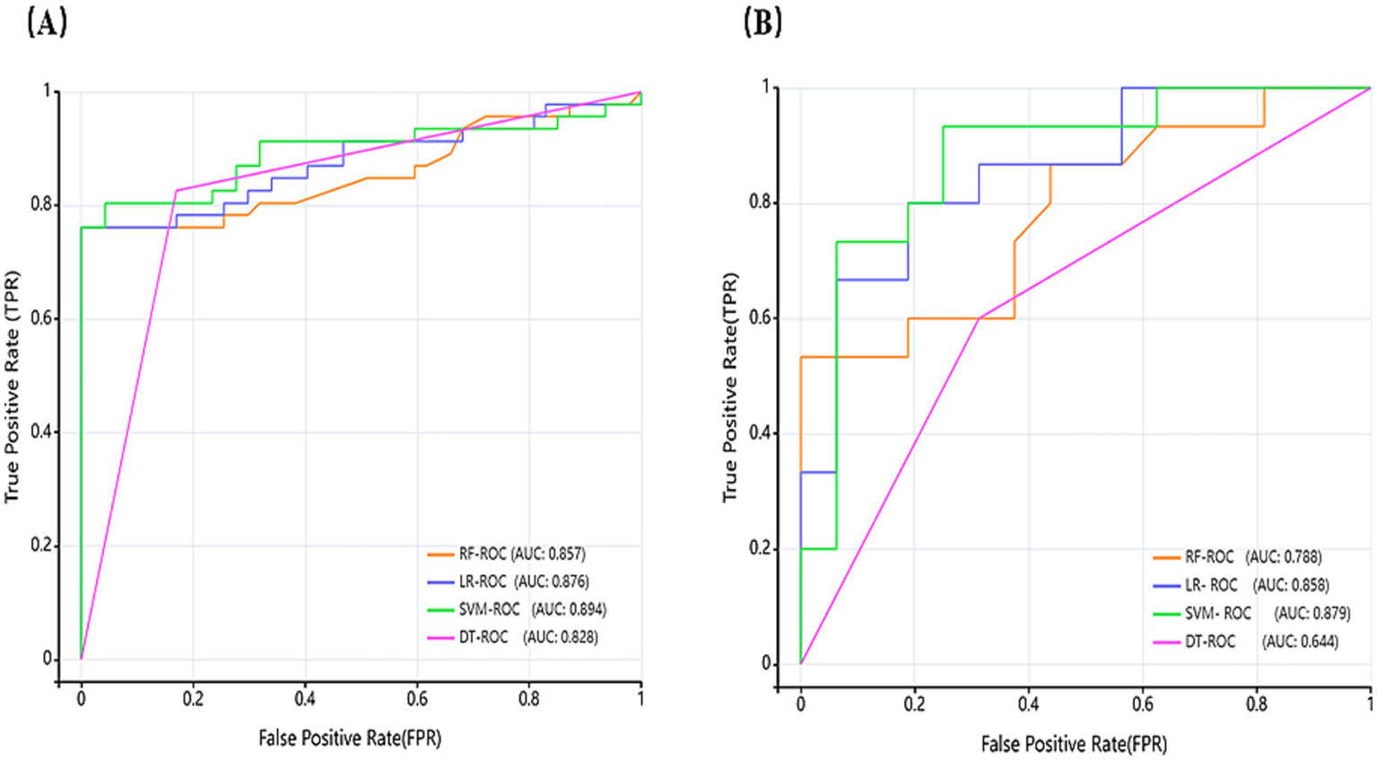 Receiver operating characteristic (ROC) curves of models (A) depicts the ROC of the test set, and (B) depicts the ROC of the external validation set.