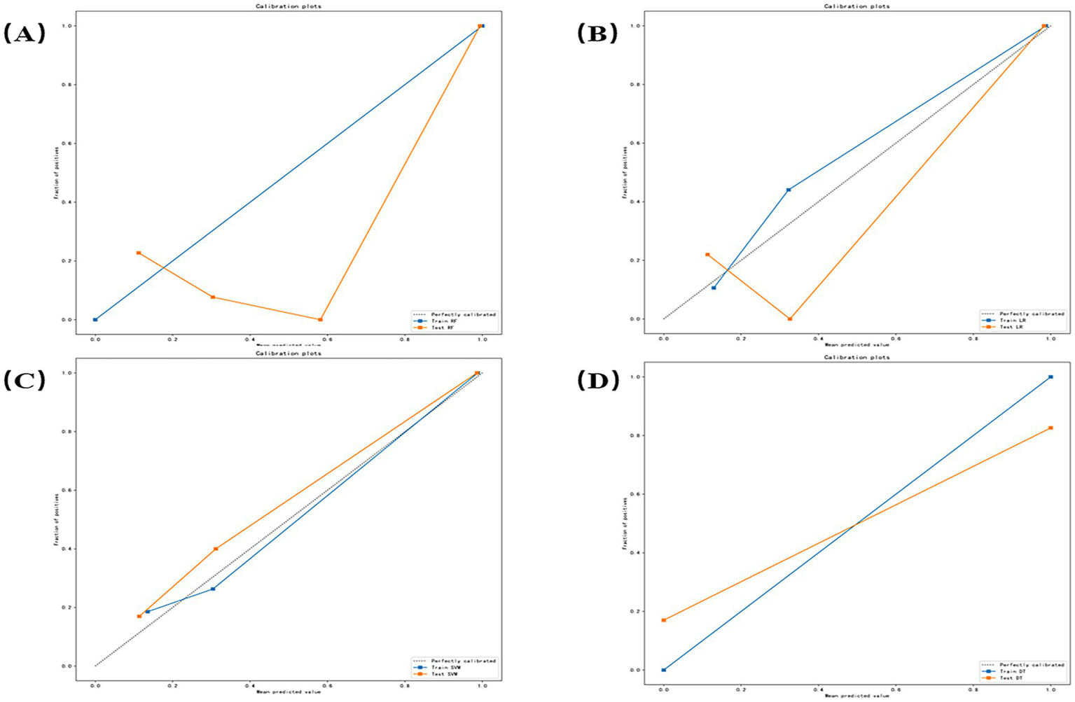 Calibration curves for each model (A–D) correspond, respectively, to the random forest (RF), logistic regression (LR), support vector machine (SVM), and decision tree (DT) models.