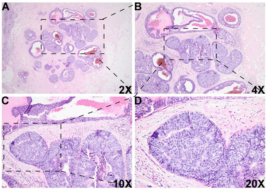 Histologic images of the DCIS-like IDC area. There was another morphologically similar area adjacent to the DCIS area, which was composed of multiple well-bordered, expanded acini with monotonous epithelioid cells and dilated cystic changes [2X (A), 4X (B), 10X (C), and 20X (D)].