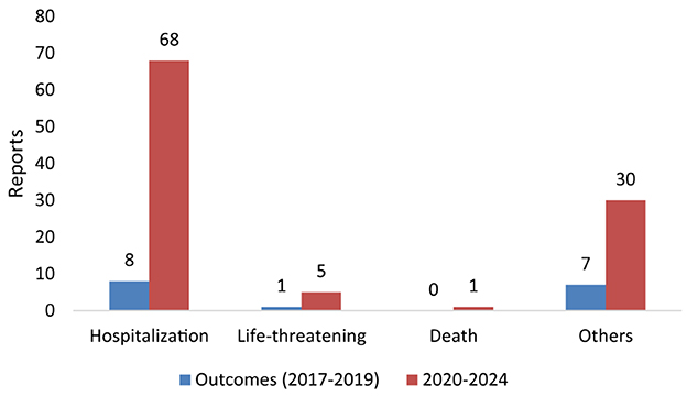 Table 2 indicates the reports of TIN cases associated with statin use in the period before the pandemic (2017–2019). Only 16 cases of TIN were reported, of which 12 (75%) were male and 3 (18.8%) were female, and sex was unknown for one (6.3%) case. The age distribution showed that 10 (62.5%) cases were reported in the 61–90 years age group, followed by 4 (25.0%) in the 41–60 years group. Regarding the occupation of reporters, 7 (43.8%) were other healthcare professionals and 5 (31.3%) were physicians. Of the 16 TIN cases reported in this period, the outcome was hospitalization in 8 cases, while 1 outcome was life threatening (Figure 1).