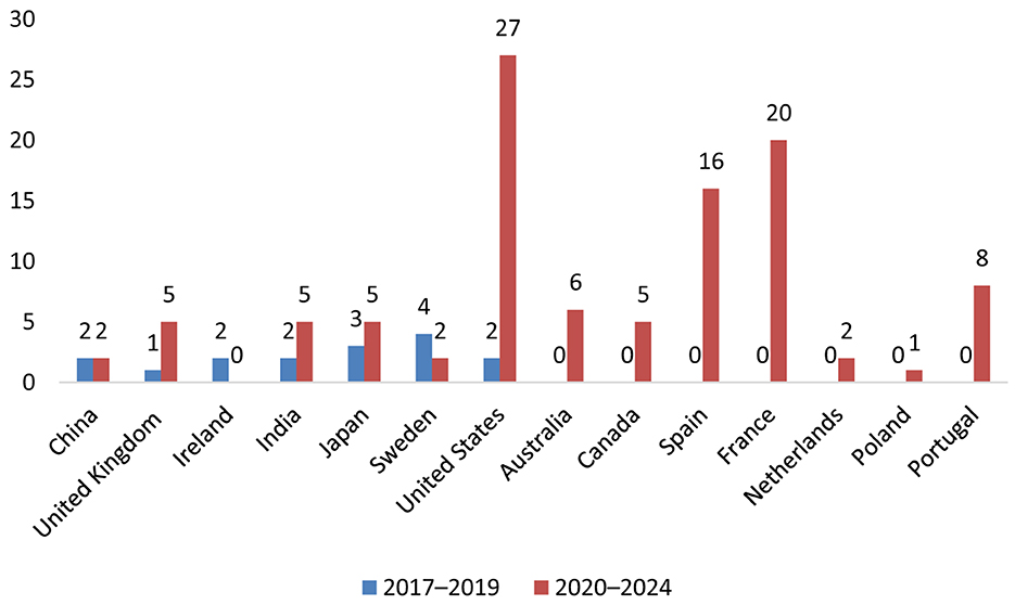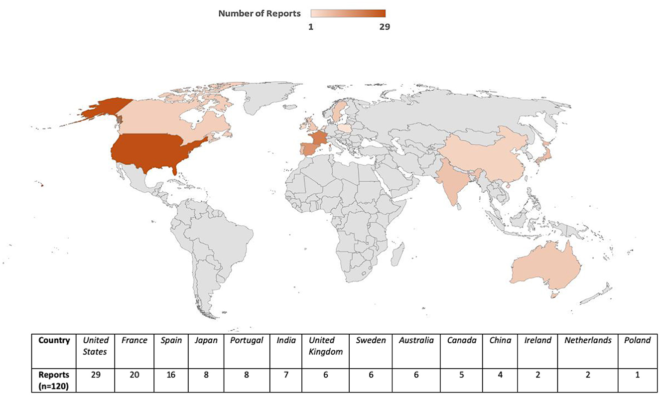 Reports originated from 13 countries and the United States accounted for the largest proportion of cases (n = 29), followed by France (n = 20), Spain (n = 16), and Australia (n = 6) (Figure 2). This geographic variability may reflect differences in statin prescribing patterns, pharmacovigilance awareness, or reporting practices. The period-wise comparison of geographic distribution is depicted in Figure 3.