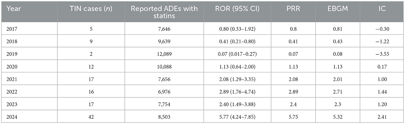 The biological plausibility of statin-induced TIN is supported by histopathological descriptions in previous reports. TIN is primarily driven by immune-mediated inflammation of the interstitium and tubules, often drug-induced, accounting for up to 75% of cases (18). In our study, the clinical seriousness of outcomes alongside rising statistical signals supports the hypothesis that statins may trigger an immune-allergic renal response in susceptible individuals. This is further supported by previous case reports, such as those by Londrino et al., Annigeri and Mani, and González Martínez et al. where renal dysfunction resolved after discontinuation of statins (13, 16, 30). Importantly, such responses are often delayed and can be masked by the insidious nature of TIN, which lacks pathognomonic symptoms.