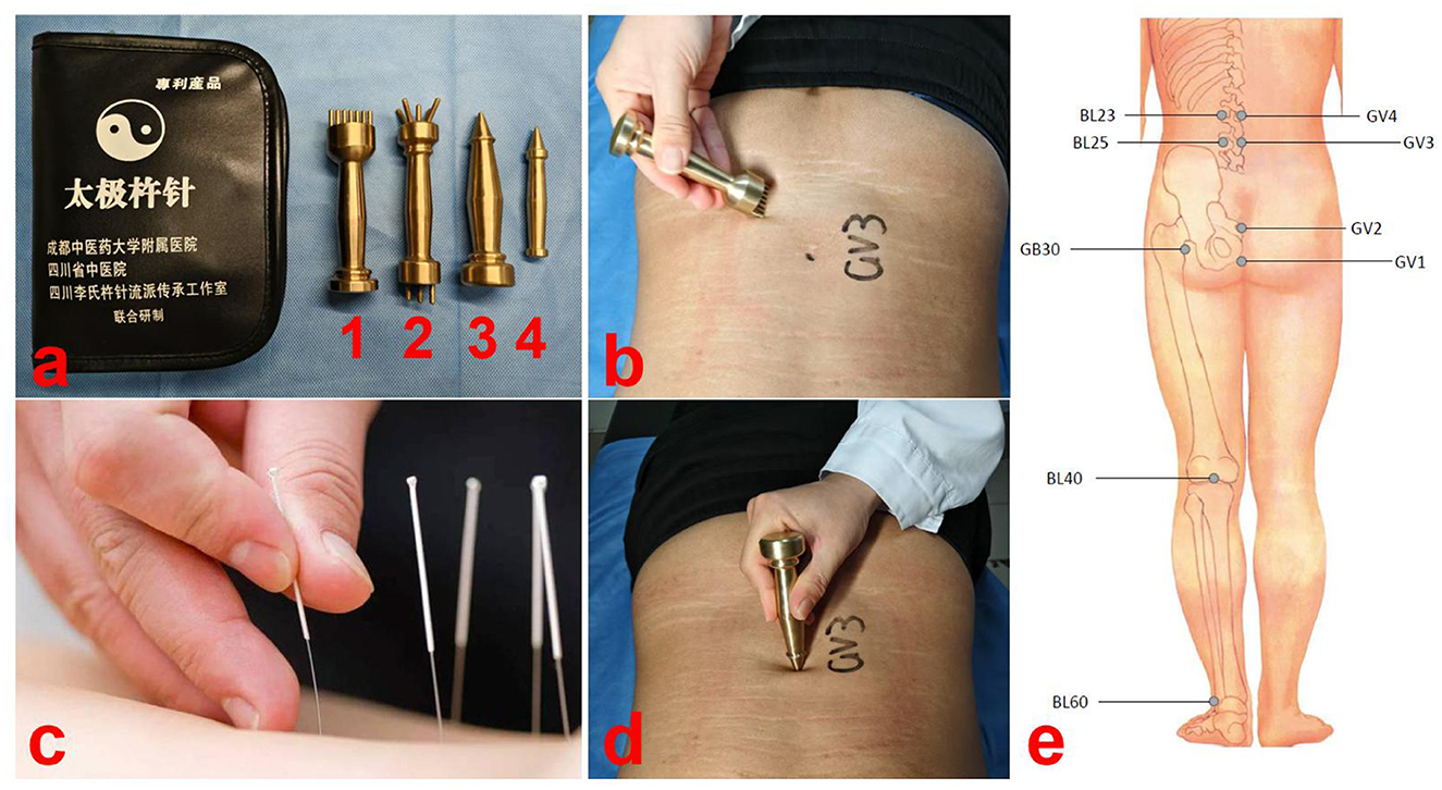 Figure 1. Demonstration diagram of Chuzhen therapy. (a) Chuzhen therapy involves the use of four blunt-ended needles made of brass (No. 1: Qiyao Hunyuan Chuzhen, No. 2: Wuxing Santai Chuzhen, No. 3: Jingang Chuzhen, and No. 4: Kuixing Chuzhen). (b) Using the tip of No. 1 Chuzhen, we performed the Tai Chi technique seven times in a counterclockwise direction at the center of the Yaoyangguan acupoint (GV3). (c) Demonstration diagram of acupuncture. Acupuncture requires piercing the skin, while Chuzhen does not. (d) Performing 49 taps with the No. 2 Chuzhen at the acupoint yaoyangguan (GV3). (e) Locations of Chuzhen therapy.