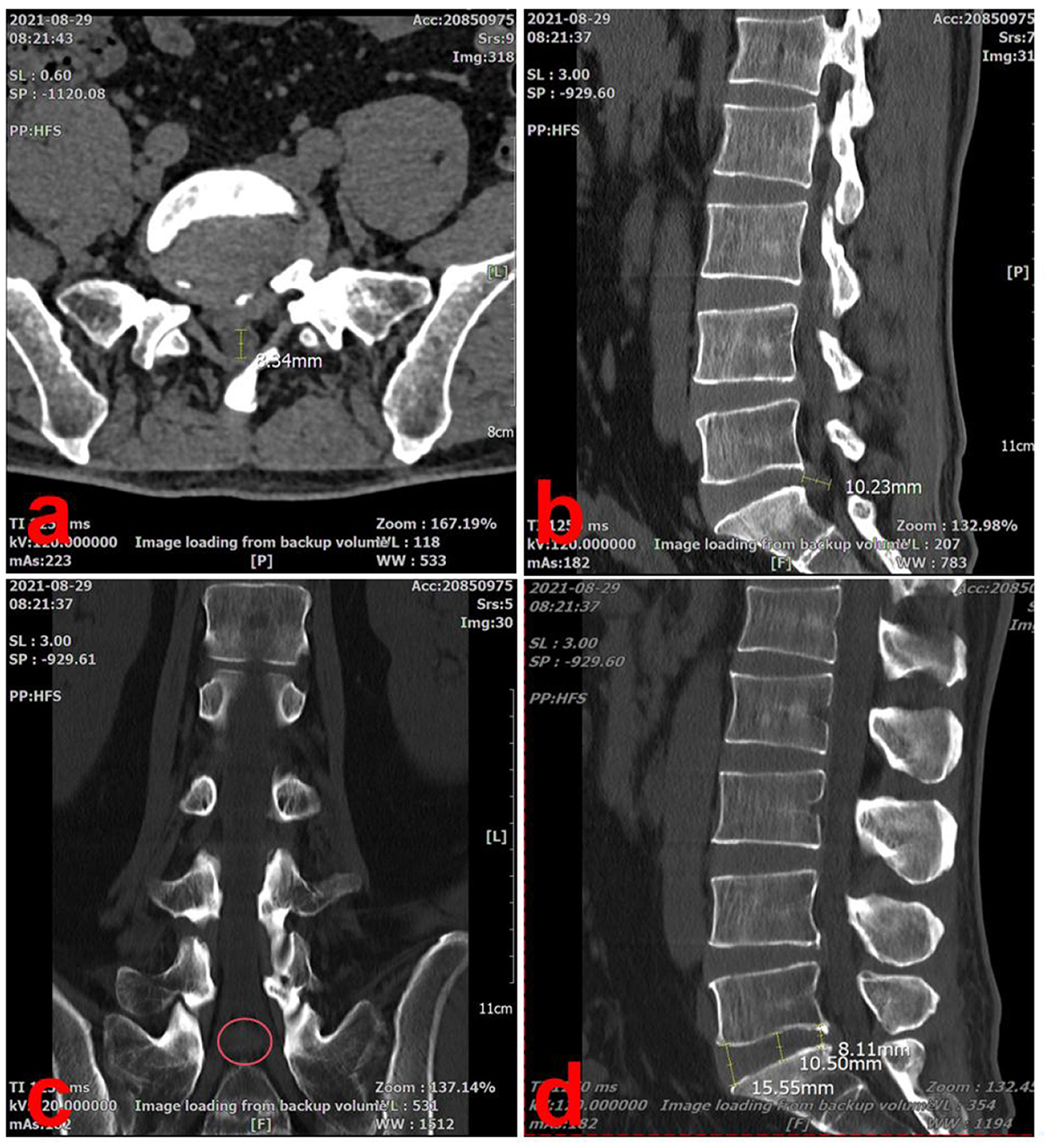 Figure 2. Lumbar spine CT scan at the initial visit (2021-08-29). (a) On the cross-section view, the diameter of the spinal canal at the L5/S1 level was 8.34 mm. (b) On the sagittal view of the L5/S1 intervertebral space, the herniated disc measured 10.23 mm in length. (c) The coronal view, the herniated disc was compressing the right S1 nerve root, consistent with the patient's symptoms (red circle). (d) On the sagittal view, the height of the lumbar intervertebral space was 11.83 mm.