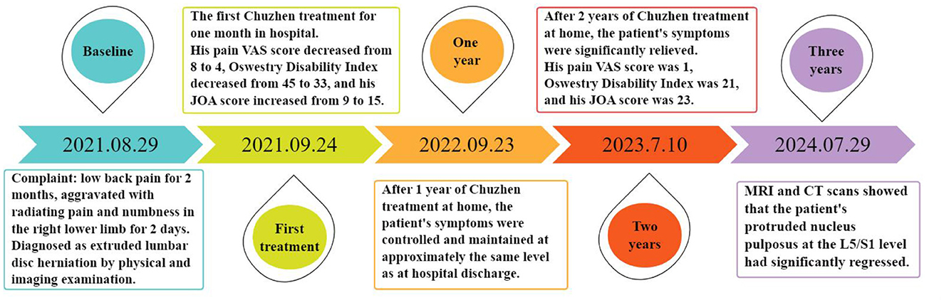 After 1 month of Chuzhen treatment, the patient's pain intensity decreased from 8 to 4 on the VAS, lumbar JOA score improved from 9 to 15, and ODI score decreased from 45 to 33. However, due to financial obligation requiring him to work as a driver, the patient was unable to continue visiting the hospital for Chuzhen treatment. During the treatment period, his wife, who is a nurse, learned about Chuzhen therapy as an easy-to-handle and non-invasive treatment technique. Therefore, she enrolled in a 2-week training course on Chuzhen therapy organized by us on a regular basis and received a certificate of competency. His wife provided Chuzhen treatment at home to prevent the recurrence of symptoms, enabling the patient to work long hours off-site as a driver without worrying. The treatment regimen administered at home is identical to that provided in hospital settings, with the patient's spouse responsible for monitoring and documenting progress. Adherence is further ensured through online check-ins and quarterly follow-up appointments. The timeline of the patient's treatment is shown in Figure 3. Symptoms initially recurred at the end of the outpatient treatment but were significantly relieved after 1 year and nearly eliminated after 3 years. During follow-up period nearly 3 years, the patient had no complications. The evolution of the patients' VAS, JOA and ODI scores over the course of treatment is summarized in Supplementary Figure 1.