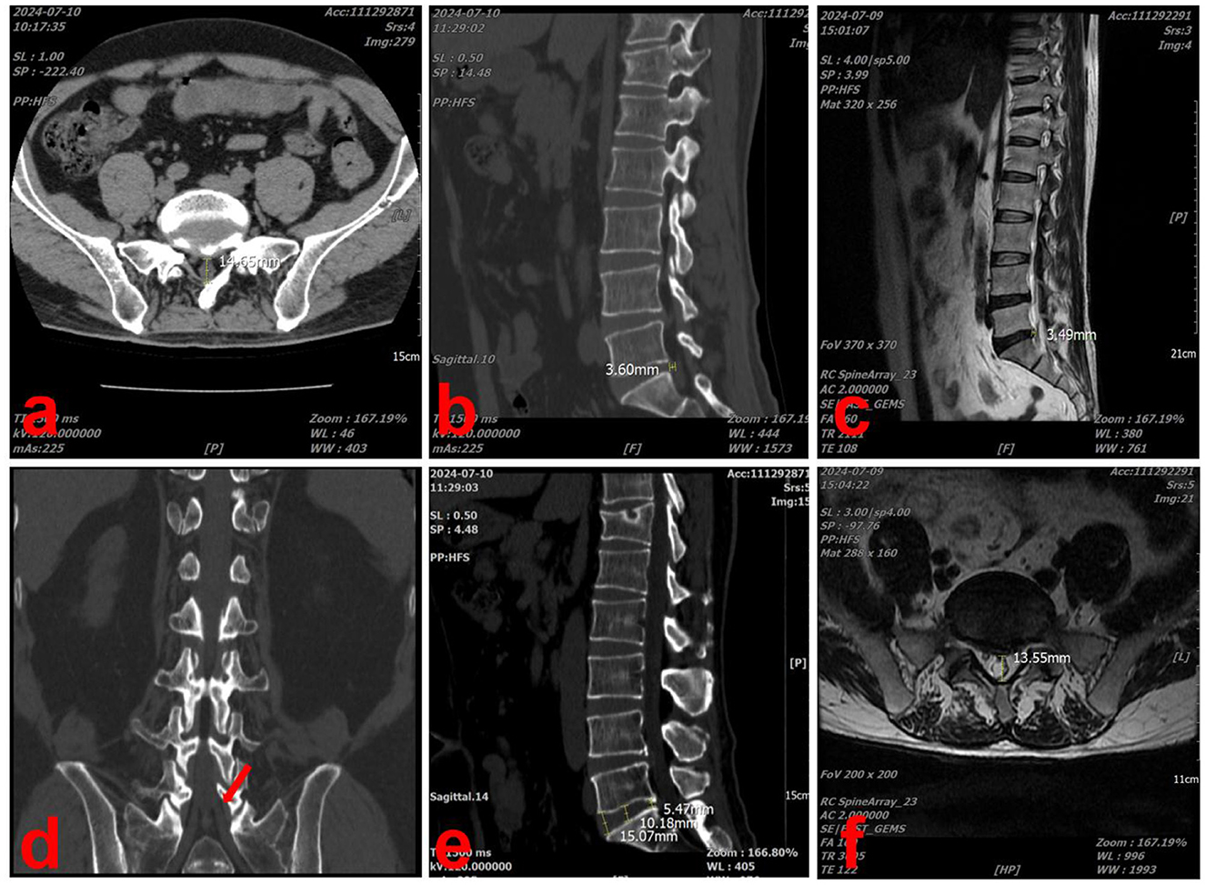 Figure 4. Lumbar spine CT and MRI scans performed at the last visit (2024-07-09). (a) In the CT cross-section, the diameter of the spinal canal at the L5/S1 level was 14.65 mm. (b) In the CT sagittal-section, the herniated disc measured 3.60 mm in length. (c) In the MRI sagittal-section, the herniated disc measured 3.49 mm in length. (d) In the coronal section, there was no longer compression of the S1 nerve root by the herniated disc (red arrow). (e) In the CT sagittal-section, the height of the lumbar intervertebral space was 10.27 mm. (f) In the MRI cross-section, the diameter of the spinal canal at the L5/S1 level was 13.55 mm.