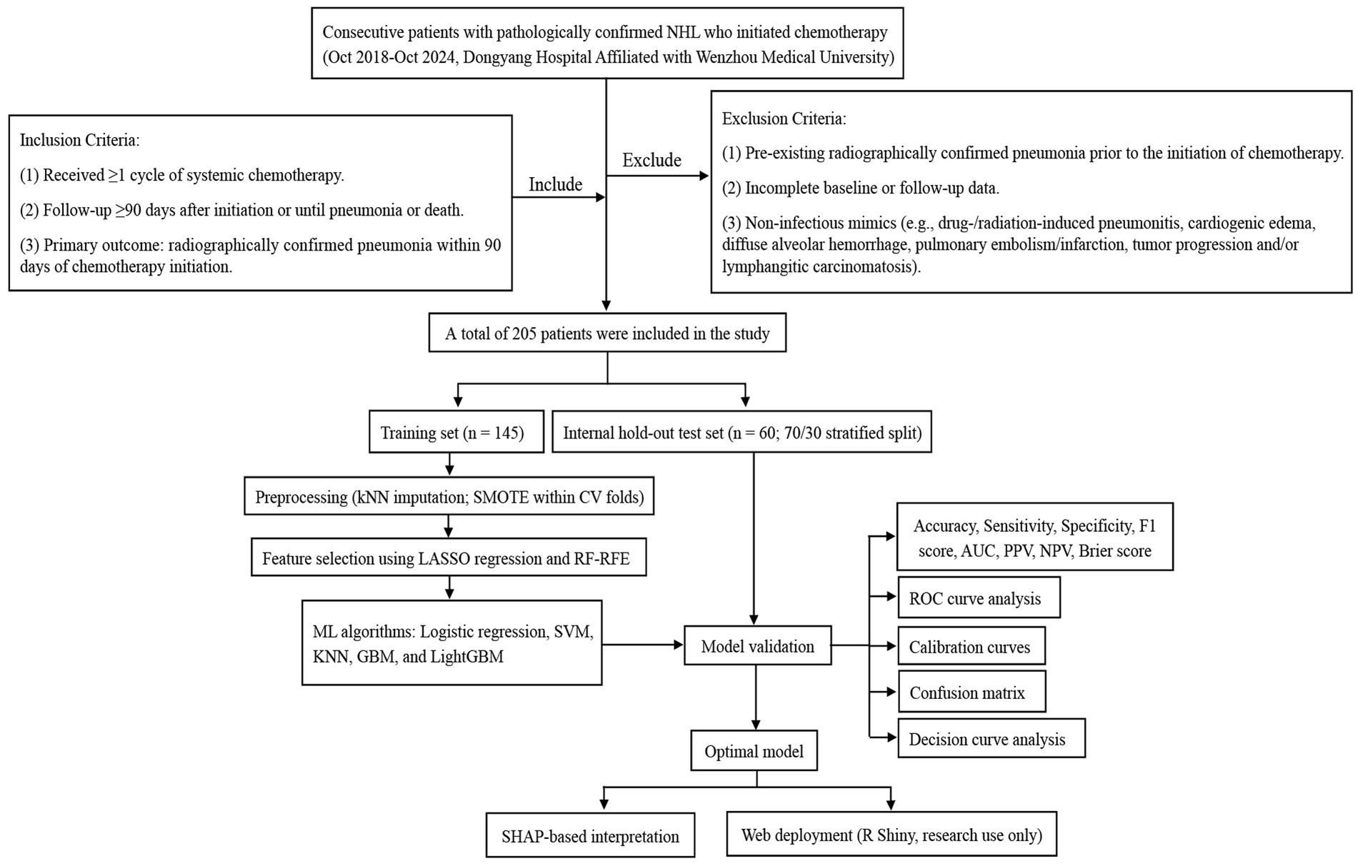 This retrospective study was conducted at Dongyang Hospital Affiliated with Wenzhou Medical University included consecutive patients with pathologically confirmed non-Hodgkin lymphoma (NHL) who initiated systemic chemotherapy between October 2018 and October 2024. Eligibility required receipt of at least one chemotherapy cycle and follow-up for at least 90 days after initiation or until the earlier occurrence of pneumonia or death. We excluded patients with radiographically confirmed pneumonia prior to the initiation of chemotherapy and those with incomplete baseline or follow-up data.