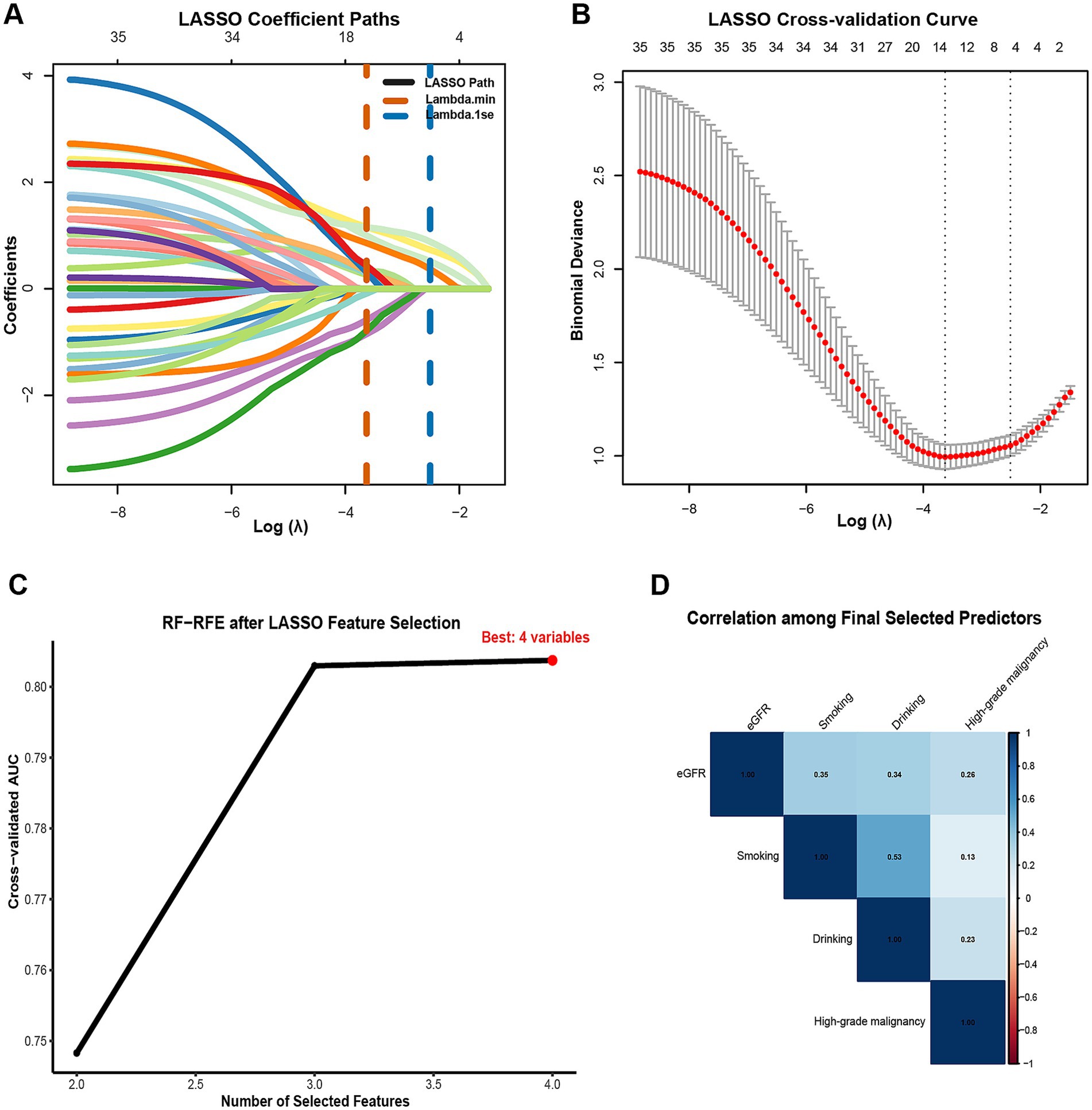Figure 2. Two-stage feature selection for predicting radiographically confirmed pneumonia within 90 days after chemotherapy initiation in NHL patients. (A) LASSO coefficient profiles across Log Lambda; vertical dashed lines mark Lambda min (orange) and Lambda 1se (blue). Numbers along the top axis indicate the count of non-zero coefficients at each Lambda. (B) LASSO 10-fold cross-validation curve showing mean binomial deviance (red) with SE bars versus Log Lambda; the parsimonious Lambda 1se was adopted for variable retention. (C) Cross-validated AUC by subset size during EPV-constrained RF-RFE after LASSO selection; the optimal subset comprised four predictors. (D) Correlation among the final selected predictors (eGFR, smoking, drinking, high-grade malignancy). numeric collinearity diagnostics (VIF/GVIF) are provided in Supplementary Table S5. Feature selection and tuning were performed strictly within training cross-validation folds; the internal hold-out test set was not used for selection.