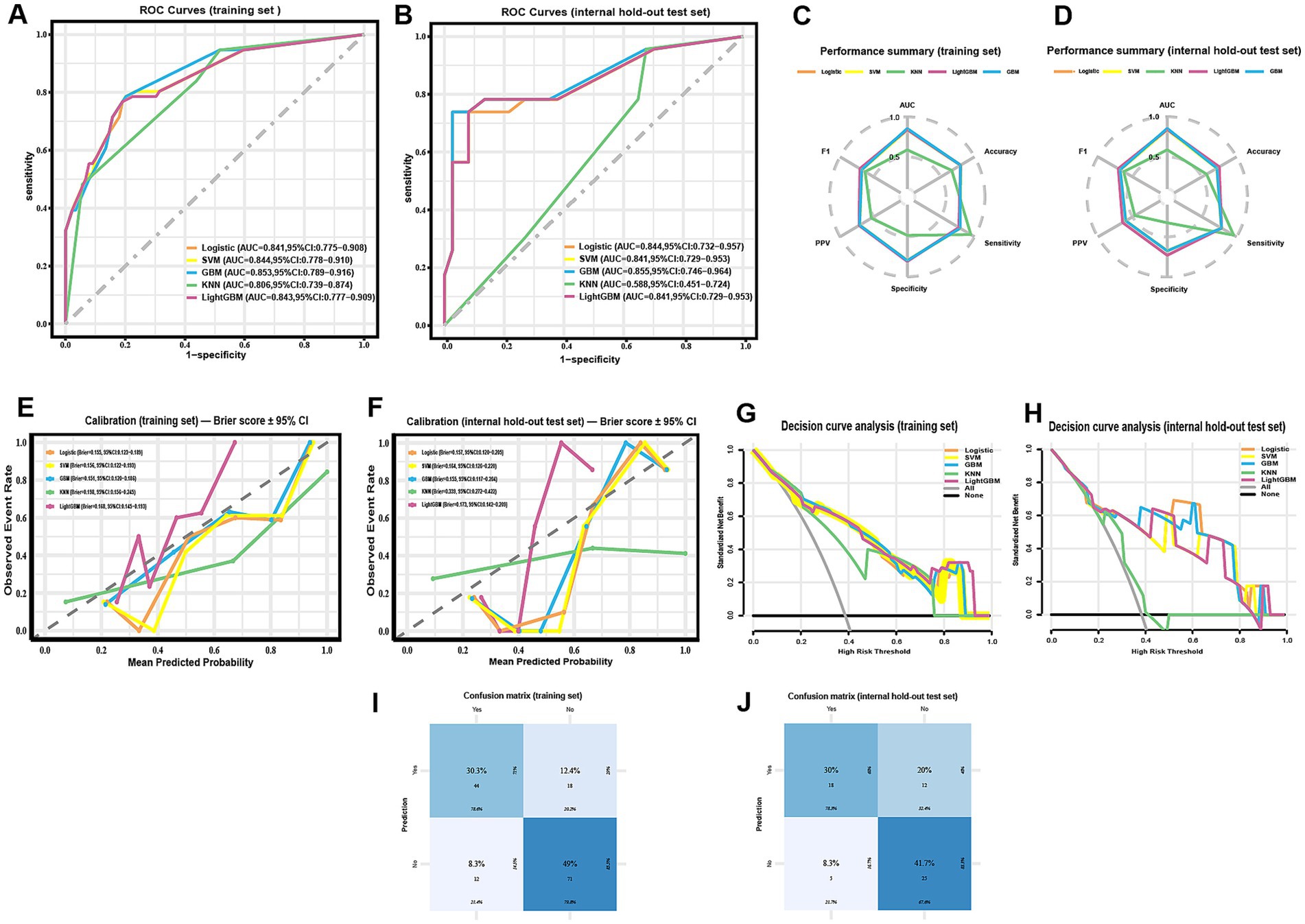 Full threshold-based metrics with 95% CIs and the corresponding confusion-matrix counts (TP/TN/FP/FN) for all models are provided in Table 3. For completeness, training-set metrics with 95% CIs are provided in Supplementary Table S7. As illustrated in the radar plots (Figures 3C–D), GBM outperformed the other algorithms in terms of overall discrimination (AUC) and achieved balanced sensitivity and predictive values. LightGBM yielded slightly higher accuracy (0.750 vs. 0.717) and specificity (0.730 vs. 0.676), but GBM maintained the most robust overall performance across metrics. Calibration curves demonstrated good agreement between predicted and observed risks for GBM, with Brier scores of 0.151 (training) and 0.155 (internal test) (Figures 3E–F; Table 3). Decision-curve analysis showed comparable net benefit for GBM, logistic regression, SVM, and LightGBM across most clinically relevant thresholds, with no uniform winner; KNN underperformed (Figures 3G–H). These patterns support decision-analytic utility under internal validation. The confusion matrices further illustrate the classification performance of the GBM model in both the training set (Figure 3I) and the internal hold-out test set (Figure 3J). In the training set, correct predictions predominated, with relatively balanced error rates across positive and negative classes. In the test set, although overall discrimination was maintained, a higher proportion of false positives was observed, reflecting a modest decrease in specificity.