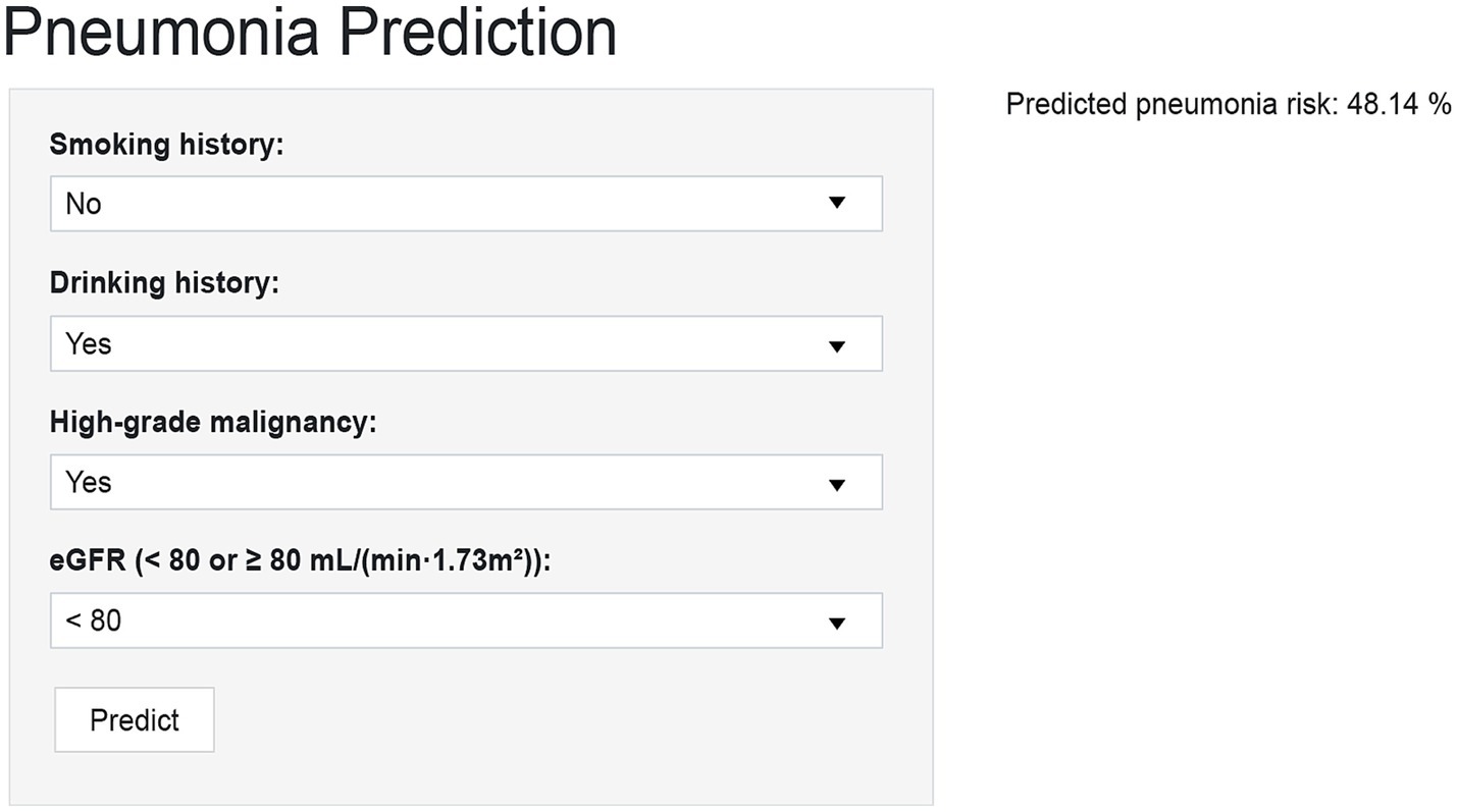 To improve clinical applicability, the final GBM model was implemented as an interactive web-based tool using the R Shiny framework. This online platform allows healthcare providers to input patient-specific clinical parameters and obtain real-time estimates of the probability of pneumonia occurring within 90 days of chemotherapy initiation. The web-based tool interface contains four input fields, namely high-grade malignancy, drinking, eGFR, and smoking (Figure 5). After data entry, the system promptly computes and displays the predicted probability of pneumonia, providing a quantitative reference to support clinical evaluation. The tool is accessible through standard web browsers on both desktop and mobile devices, without the need for additional software installation. Its real-time output and integration of SHAP-based interpretive visualizations enhance transparency and support individualized risk assessment in routine hematology practice. The tool is available at: https://ltfu-zzn.shinyapps.io/Pneumonia/