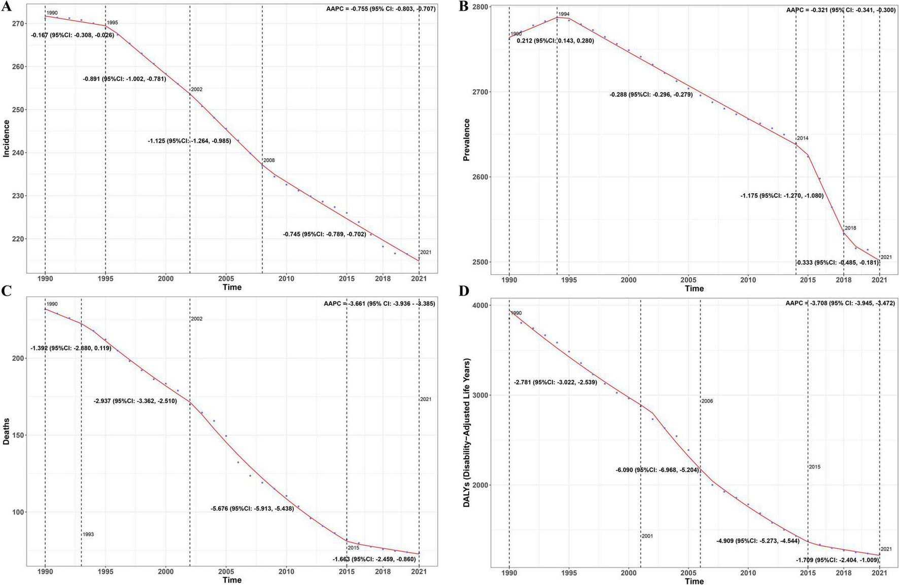 Joinpoint regression analysis indicates that between 1990 and 2021, all types of ASR for COPD showed a declining trend. However, the rate of decline in ASIR slowed after 2008, in ASPR after 2018, and in both ASMR and ASDR after 2015 (Figure 2).