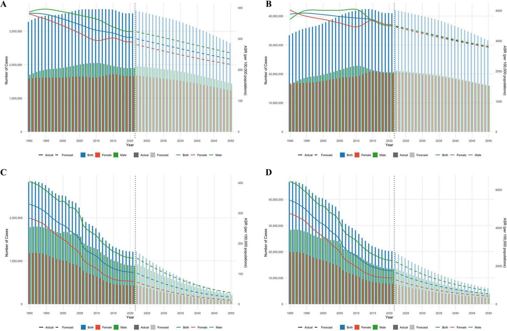 Predictive analysis results [(A) Incidence; (B) Prevalence; (C) Mortality; (D) DALYs].