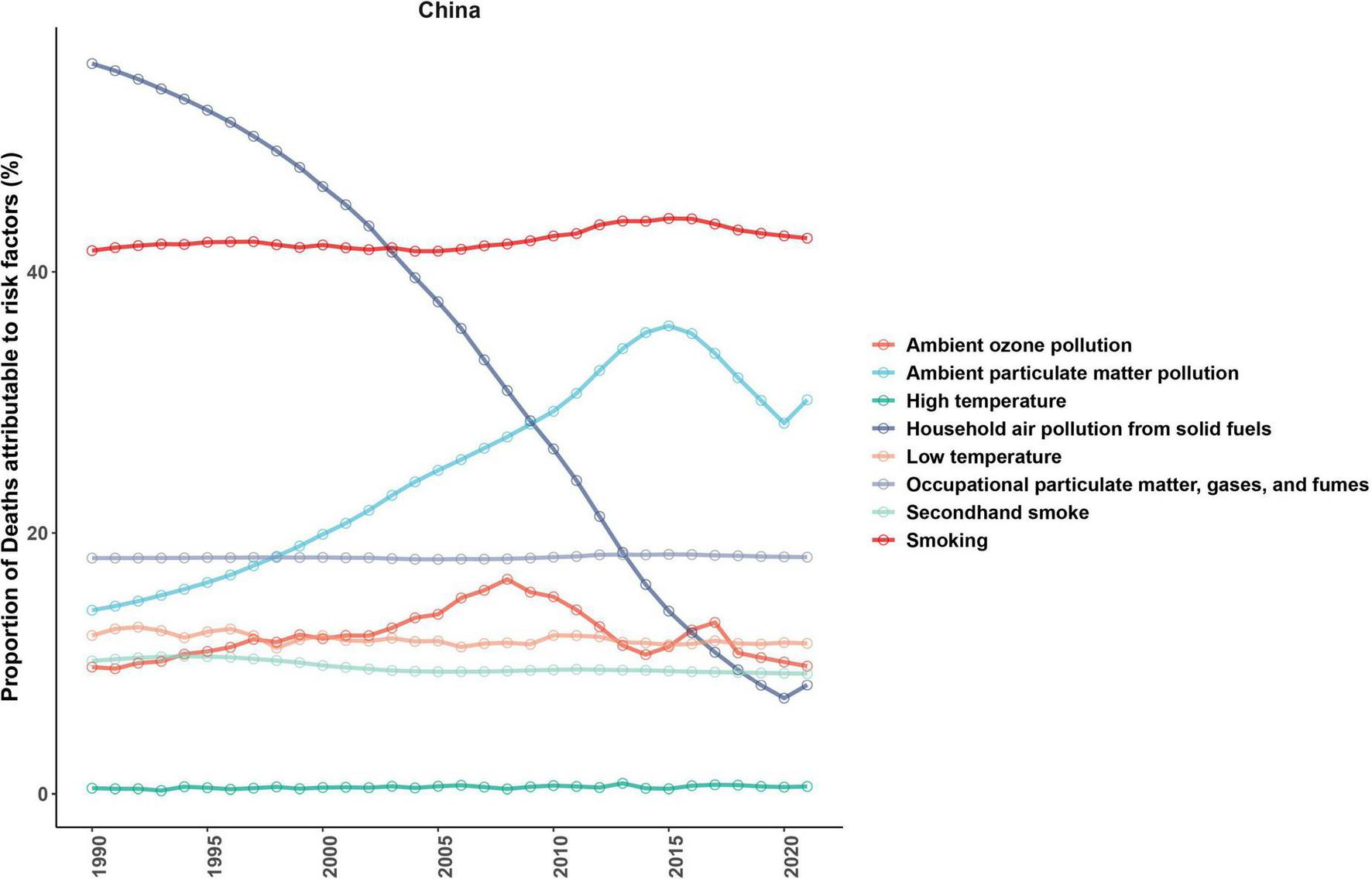 Regarding attributable risk factors, smoking remains the primary modifiable risk factor for COPD-related mortality, with its PAF rising from 41.63% in 1990 to 42.58% in 2021. This indicates that despite ongoing tobacco control policies, the large smoking base and cumulative exposure effects continue to cause significant health losses. Tobacco smoke promotes lung tissue damage through mechanisms involving airway inflammation, oxidative stress, and protease–antiprotease imbalance, with men being more prone to the emphysema type of COPD, which carries a higher risk of mortality (37, 40). The PAF for environmental particulate exposure follows an inverse U-shape, peaking in 2008 at 35.86% (95% CI: 35.27–36.46), before decreasing to 30.20% in 2021. Although the concentrations of pollutants like PM2.5 have significantly decreased, urban heat island effects and extreme temperature variations still pose a significant threat to elderly populations (41, 42). The PAF for cold exposure has remained at around 11.50%, significantly higher than that for heat exposure (0.55% in 2021). This difference is attributed to mechanisms such as bronchospasm, impaired mucociliary function, and increased infection risk, particularly in the elderly (43, 44). The PAF for solid fuel use decreased by more than 85%, highlighting the effectiveness of China’s clean energy policies, though rural areas in the western regions remain concentrated sites of residual risk, requiring solutions such as increased clean energy adoption and improved indoor ventilation (45, 46). Occupational exposure has remained stable at around 18%, suggesting that occupational health management still needs improvement, with continued exposure in high-risk industries like mining and construction maintaining high COPD burdens in men (47).