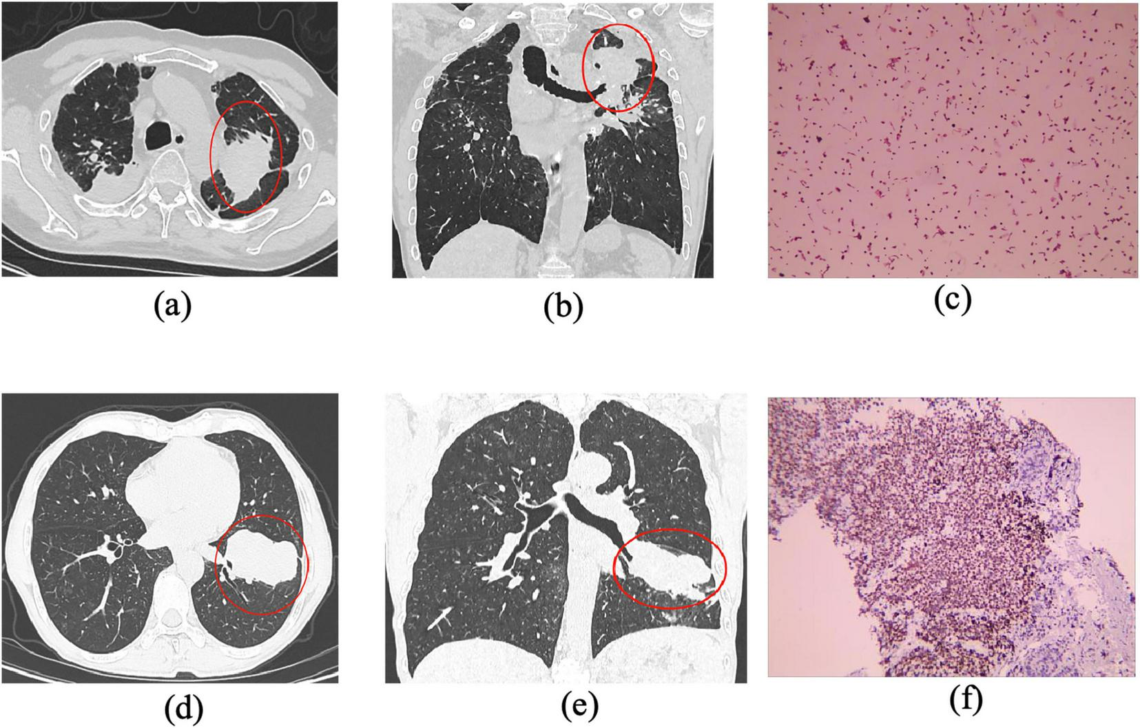 Lung cancer, especially in its peripheral form, is one of the most common and lethal malignancies worldwide. Peripheral lung cancer typically originates from the distal bronchioles or alveolar epithelium and often presents as solitary pulmonary nodules or masses located near the pleura (7). In its early stages, the disease may be asymptomatic or manifest with non-specific respiratory symptoms such as cough or chest pain (8). As the tumor progresses, features such as pleural indentation, vascular convergence, spiculation, and local invasion become more apparent. These radiologic characteristics, however, can closely mimic those of PMF, particularly when large opacities are present (9). In addition, patients with pneumoconiosis who are at risk due to occupational exposure may concurrently develop lung cancer, further complicating diagnosis (9). Unlike PMF, which generally follows a chronic, fibrotic course, peripheral lung cancer tends to grow rapidly and metastasize early, leading to poor prognosis if not identified and treated in a timely manner (10).
